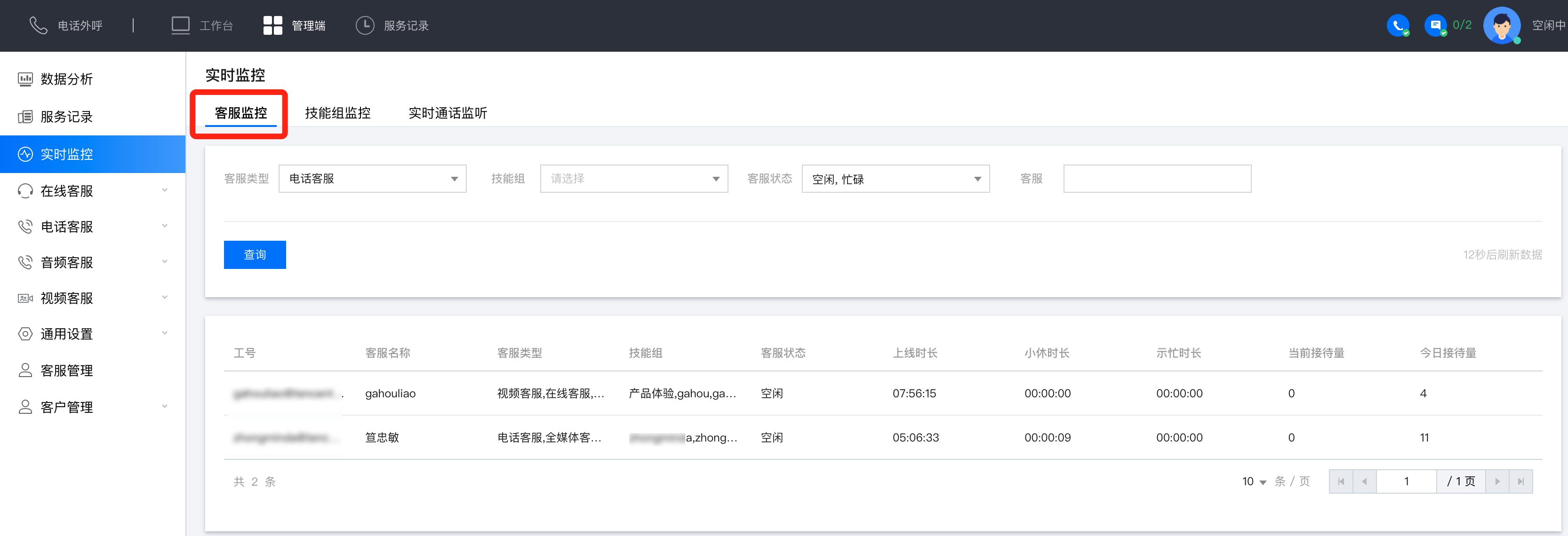筛选客服类型为电话客服,支持按技能组、客服状态、客服名称筛选。客服监控页面每20秒自动刷新。