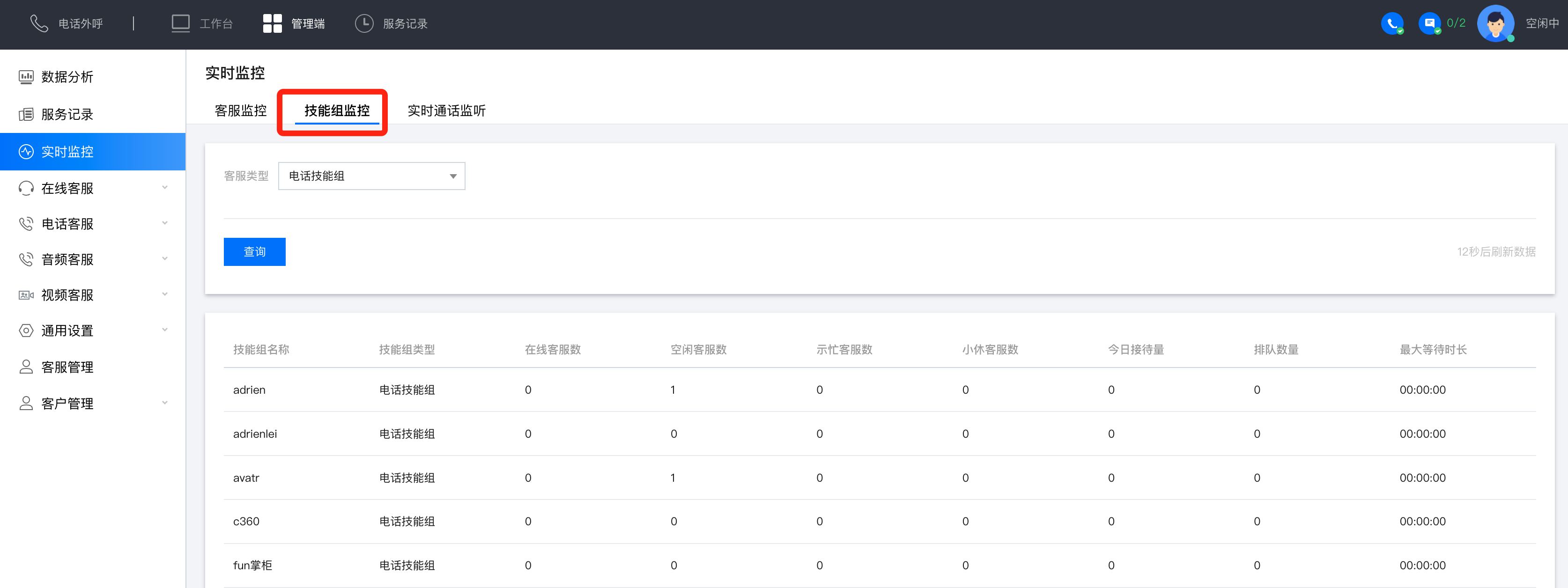 筛选客服类型为电话技能组,技能组监控页面每20秒自动刷新。