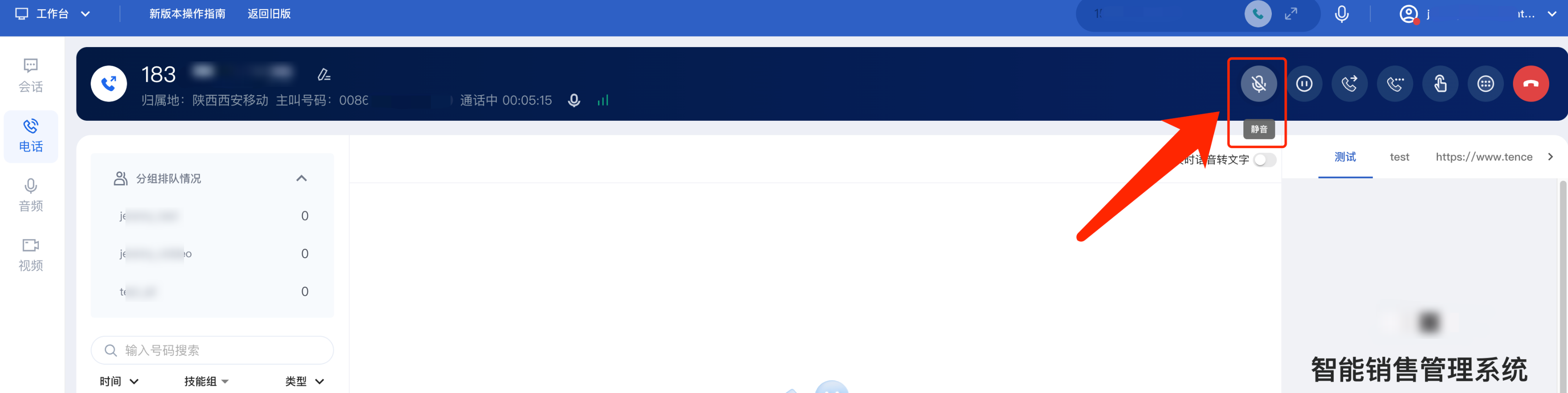 员工和用户通话过程中,若员工想咳嗽不希望用户听见,可在