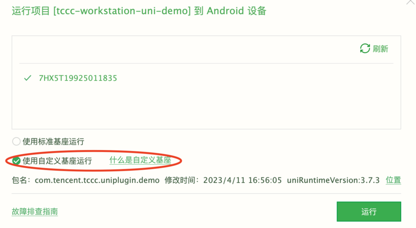 什么是自定义调试基座及使用说明,请参见 官方教程。 步骤5:运行