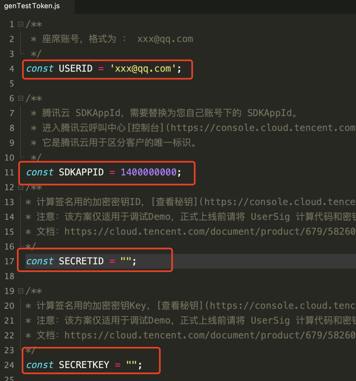 2. 设置 genTestToken.js 文件中的相关参数: