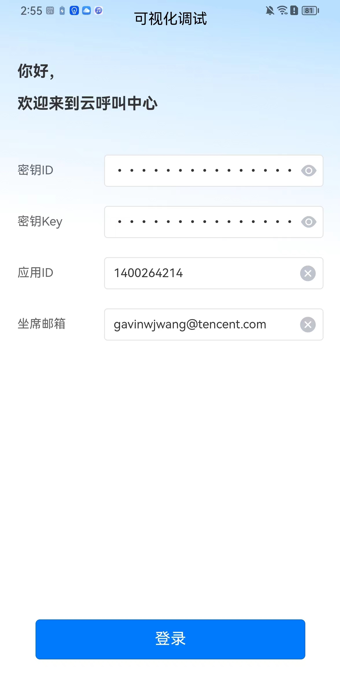 SdkAppId:是用户在 云联络中心控制台 上创建的应用 ID,称之为 SdkAppId,一个腾讯云账号最多可以创建20个腾讯联络中心应用,通常为140开头。 UserID:座席或管理员在腾讯云联络中心内配置的账号,通常为邮箱格式,首次创建应用,主账号可前往 站内信(子账号需订阅云联络中心产品消息) 查看联络中心管理员账号和密码。一个 SDKAppID 下可以配置多个 UserID,如果超出配置数量限制,需到 座席购买页 购买更多座席数量。 SecretId 和 SecretKey:开发者调用云 API 所需凭证,通过 云控制台 创建。 Token:登录票据,需要调用云 API 接口 CreateSDKLoginToken 来获取。正确的做法是将 Token 的计算代码和加密密钥放在您的业务服务器上,然后由 App 按需向您的服务器获取实时算出的 Token。 操作步骤