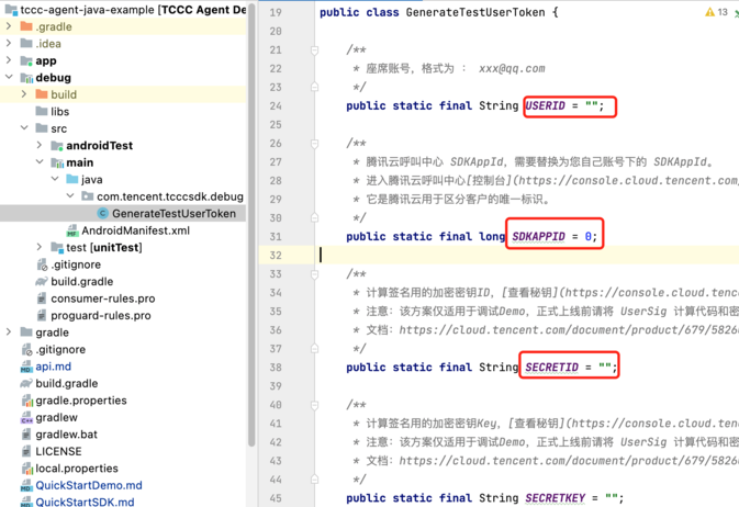 1. 找到并打开 debug/src/main/java/com/tencent/tcccsdk/debug/GenerateTestUserToken.java 文件。