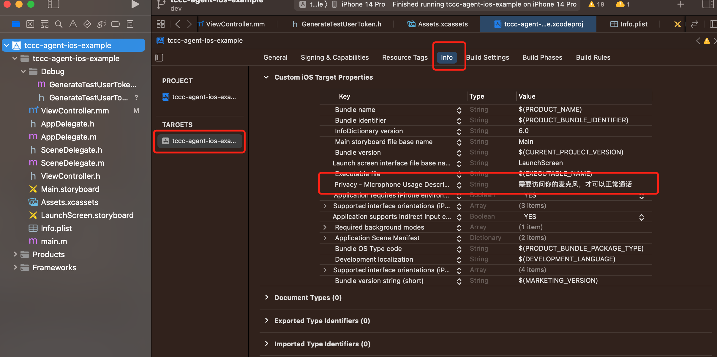 1. 如需使用 SDK 提供的音视频功能,需要给 App 授权麦克风的使用权限。在 App 的 Info.plist 中添加对应麦克风在系统弹出授权对话框时的提示信息。