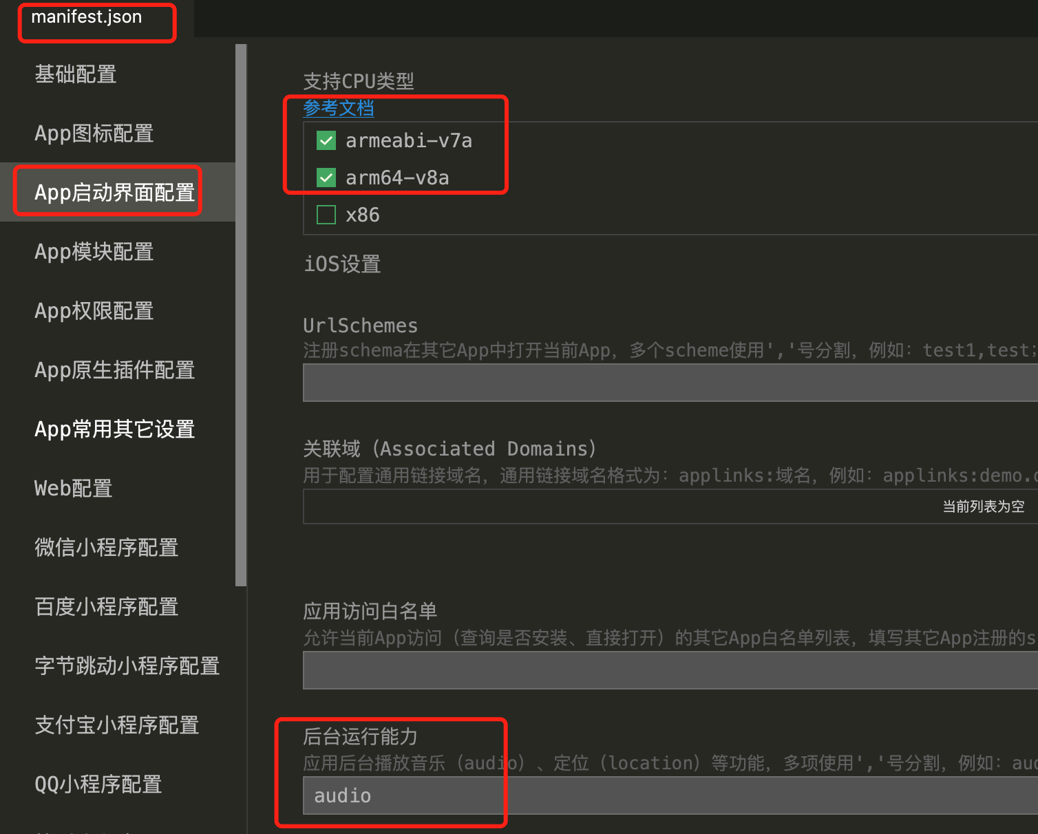 因在 iPhone 5c 以下才有该类型的 CPU,目前基本上已经无人使用了。所以我们不适配该类型的 CPU,并且在云打包 iOS 的时候需要修改配置 manifest.json 文件。