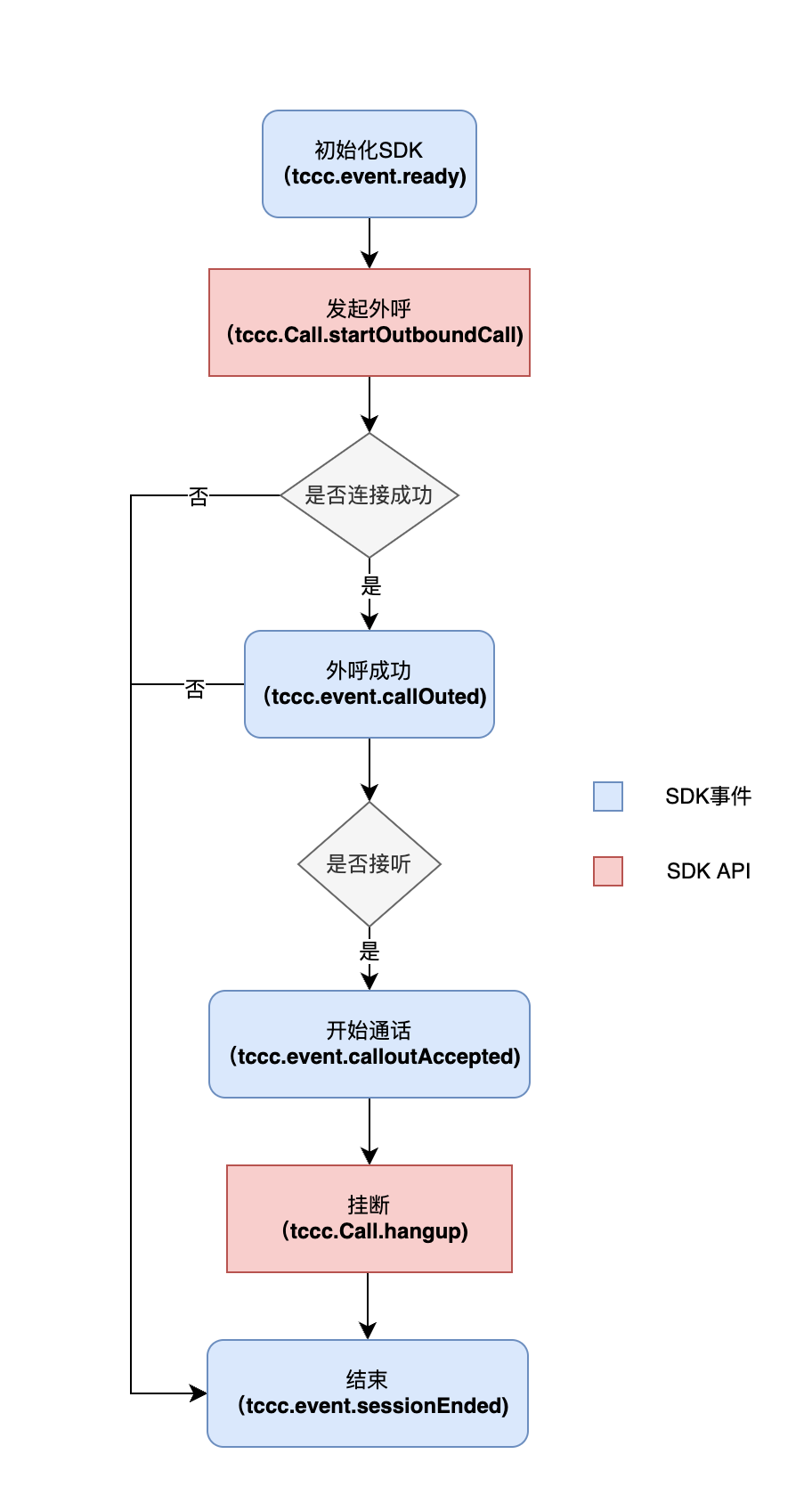 import { useState } from 'react';export function CallButton() {const [phoneNumber, setPhoneNumber] = useState('19999999999') // 请替换为真实外呼号码function sdkCall(phoneNumber) {window.tccc.Call.startOutboundCall({phoneNumber,}).then((res) => {this.sessionId = res.data.sessionId;}).catch((err) => {const error = err.errorMsg;})}return (<button onClick={sdkCall}>一键外呼</button>)}