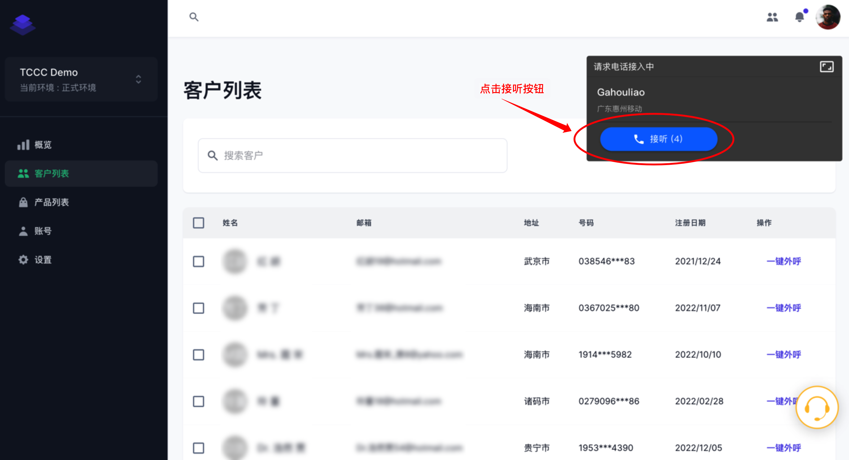 tccc.on 绑定电话呼入事件 tccc.events.callIn 来监听电话呼入,获取sessionId;tccc.Call.accept() 来主动接听。let sessionId; //存在公共区域,可以方便任意时候使用// 监听电话呼入事件window.tccc.on(window.tccc.events.callIn, (response) => {// 会话呼入时触发,将该会话的sessionId存储到公共区域sessionId = response.data.sessionId;})// 实现接听方法function accept() {if (sessionId) {window.tccc.Call.accept({ sessionId }).then(() => {// 接听成功,开始通话}).catch(err => {// 接听失败,展示详细错误原因const error = err.errorMsg;})} else {console.error('未找到需接听的会话');}}// 之后,可以在需要的地方执行 accept() 来触发接听电话