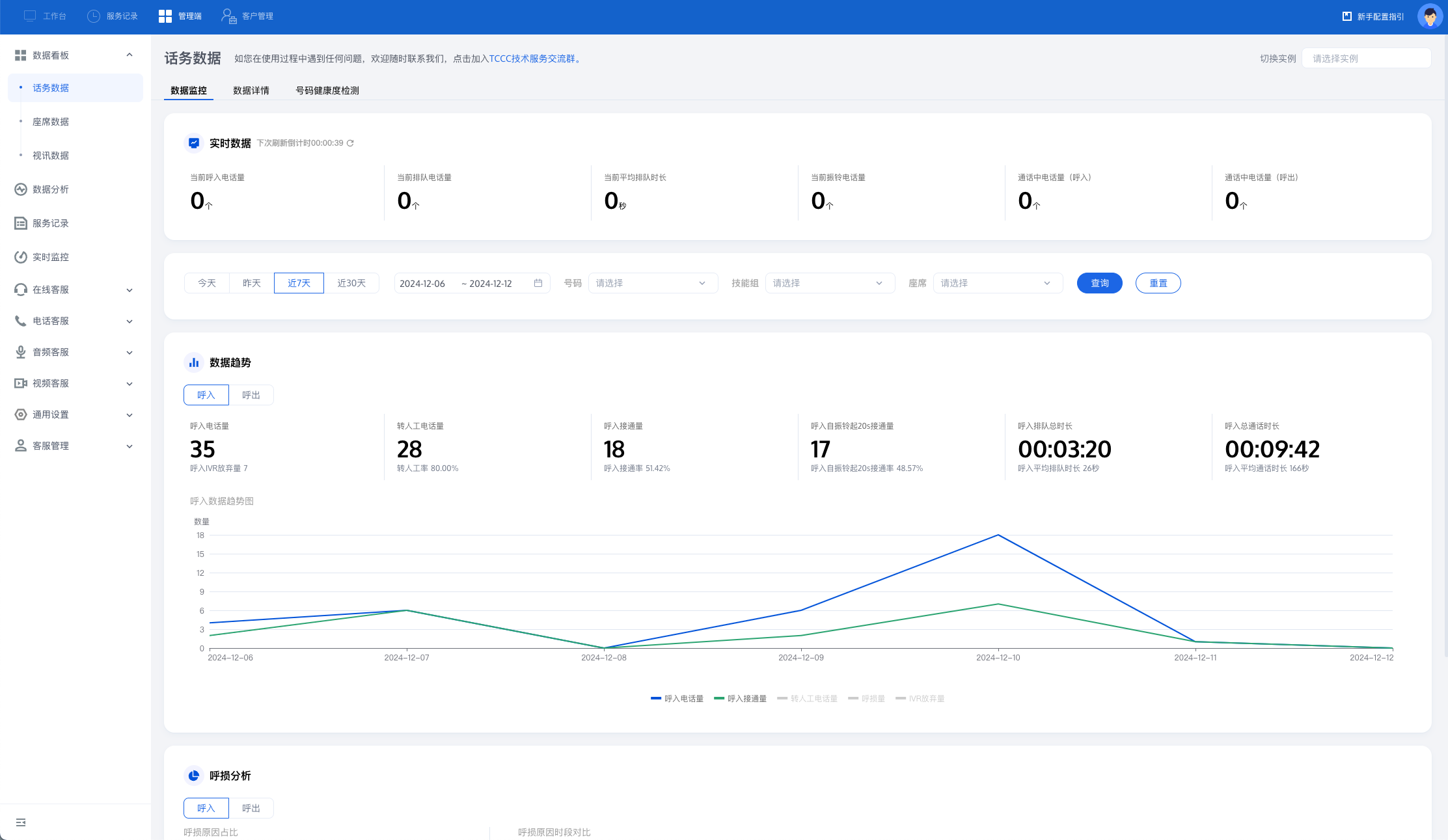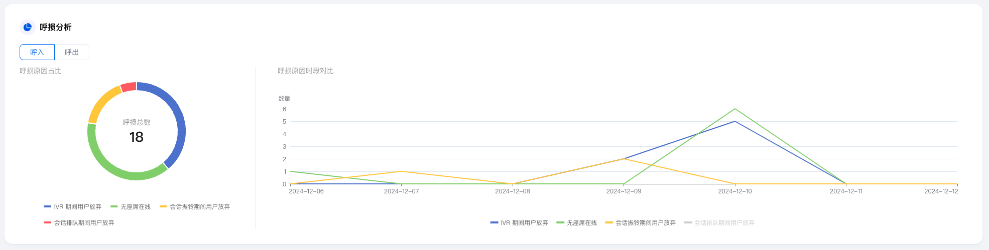 | 呼入 IVR 放弃量 | 筛选范围内,呼入 IVR 阶段未转人工就放弃的电话量。 |