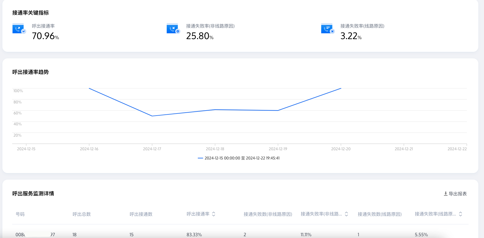 | 呼出呼损量(线路原因) | 筛选范围内,该号码外呼由于线路原因未接通的电话量。 |