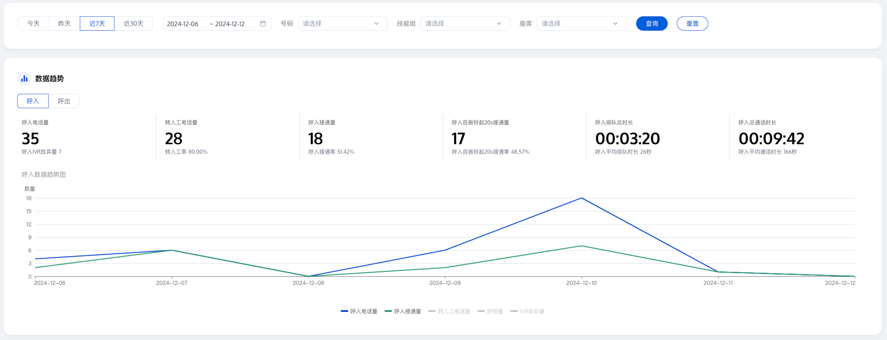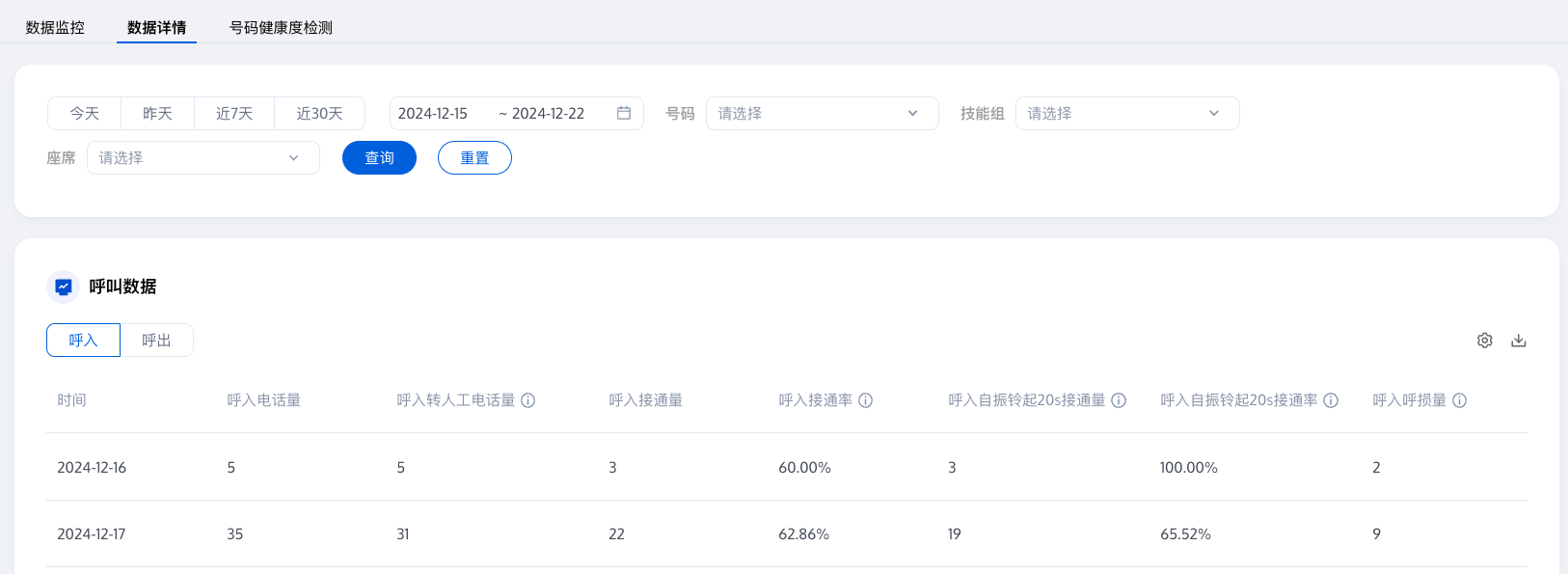 | 呼入接通量 | 筛选范围内,所有通话时长大于0的呼入电话量。 |