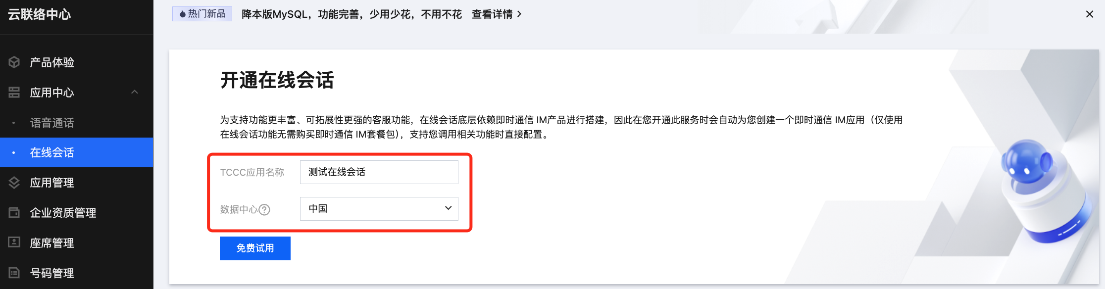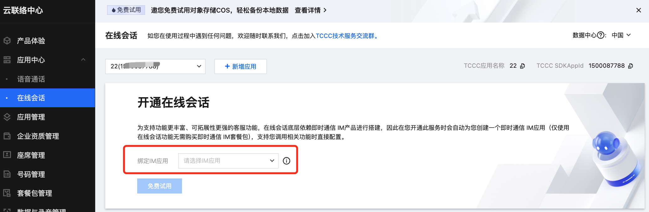 如果没有可选应用,请填写需要创建的TCCC应用名称、选择数据存储中心,再单击免费试用。