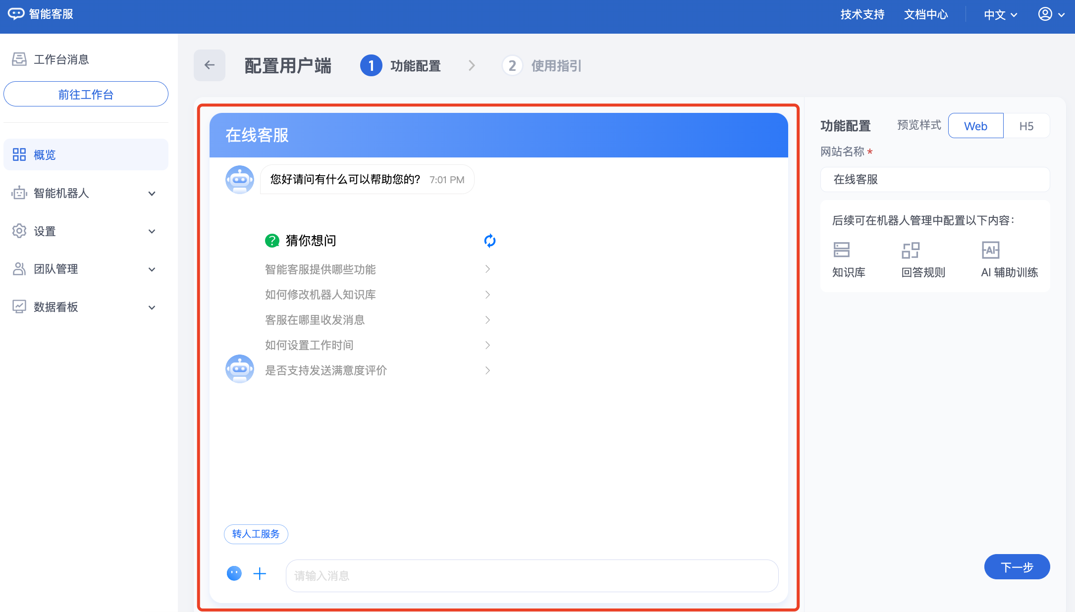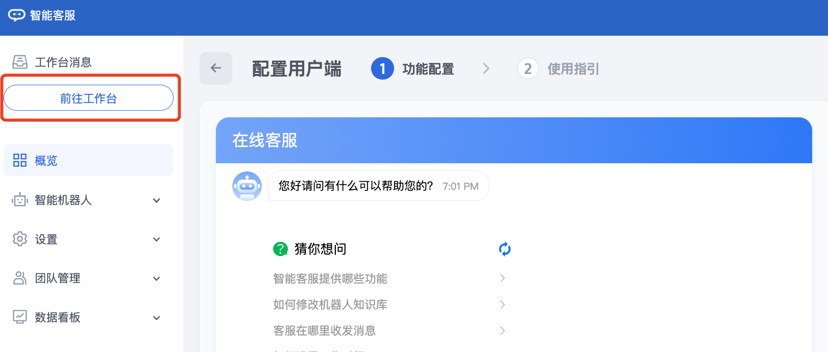 在 管理端,单击前往工作台,即可免密登录工作台,并在工作台中以员工角色查看/处理“转人工”的用户对话。