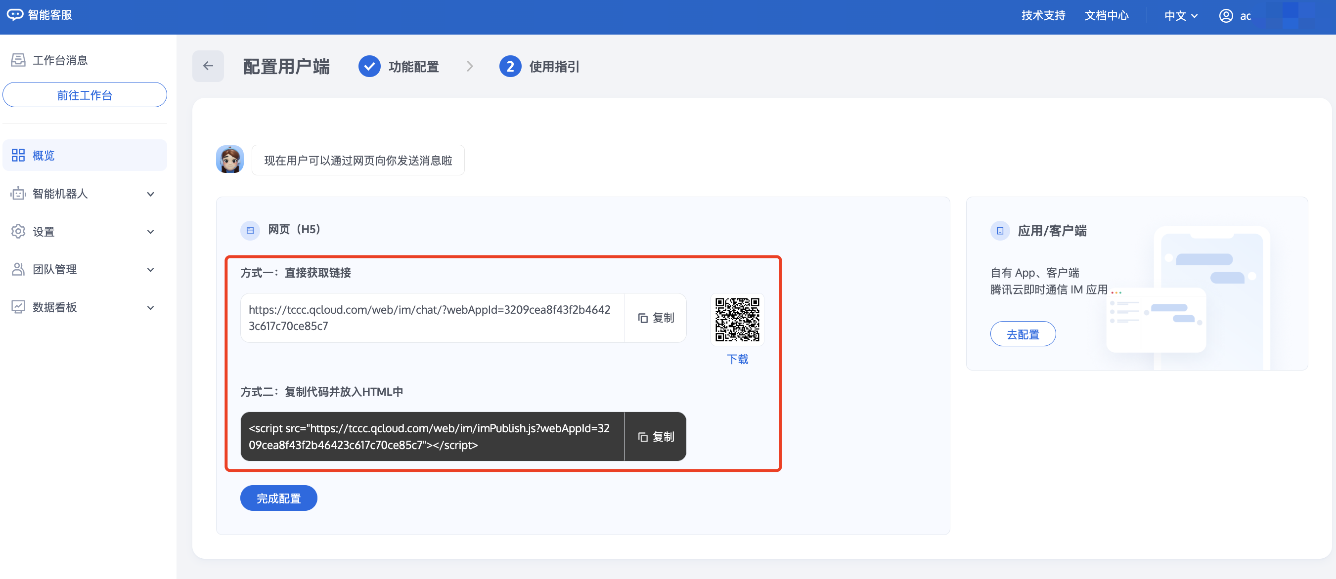 1. 开通在线会话后,云联络中心控制台 会呈现以下界面。单击前往管理端按钮,默认以超级管理员角色,免密登录 管理端。 2. 进入 管理端,在配置用户端界面,即可直接体验在用户端发送消息咨询、与机器人互动、转人工的全部环节。 3. 如果您需要邀请他人体验,或者希望在手机或者其他应用内打开用户端入口体验,可单击右下角的下一步按钮,在下方界面中获取用户端链接、二维码和代码。