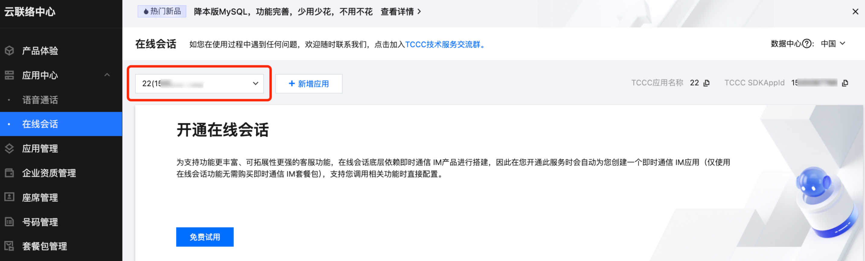 进入 云联络中心控制台,左侧导航栏选择在线会话,在选择应用后,单击免费试用(每个应用都可领取2次7天免费试用),即可开通在线会话。 如果已经可选应用,直接单击免费试用即可。