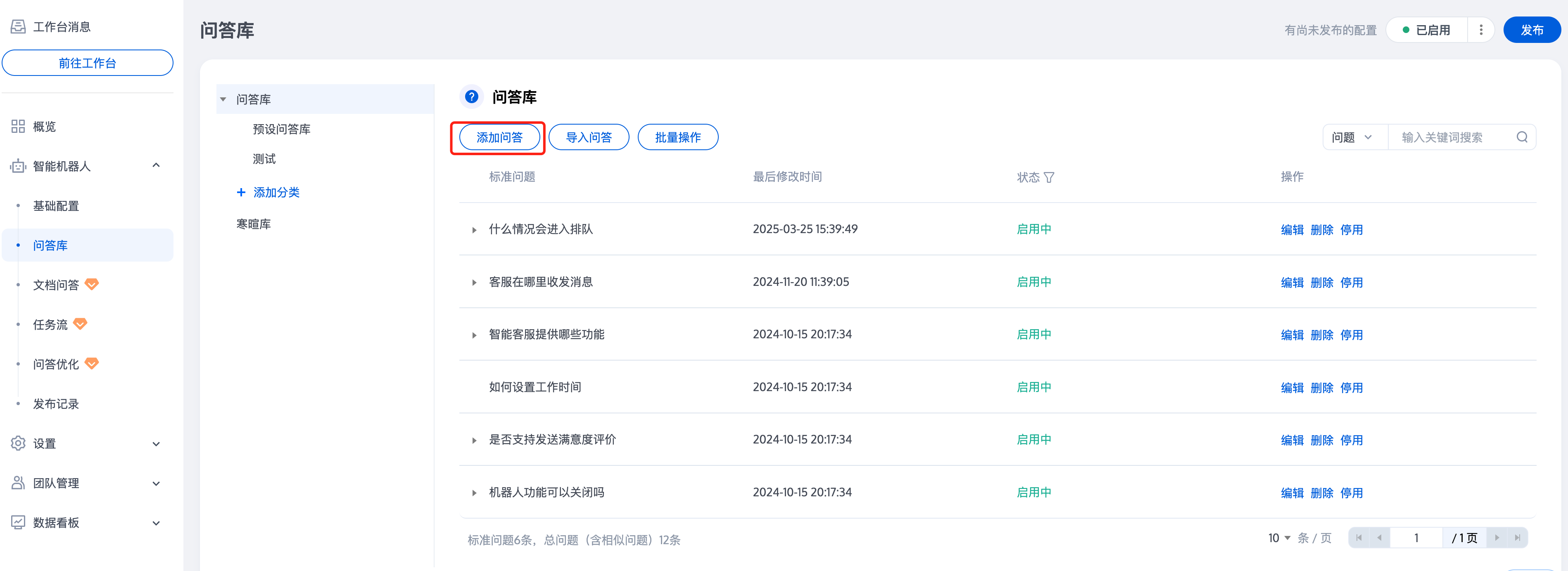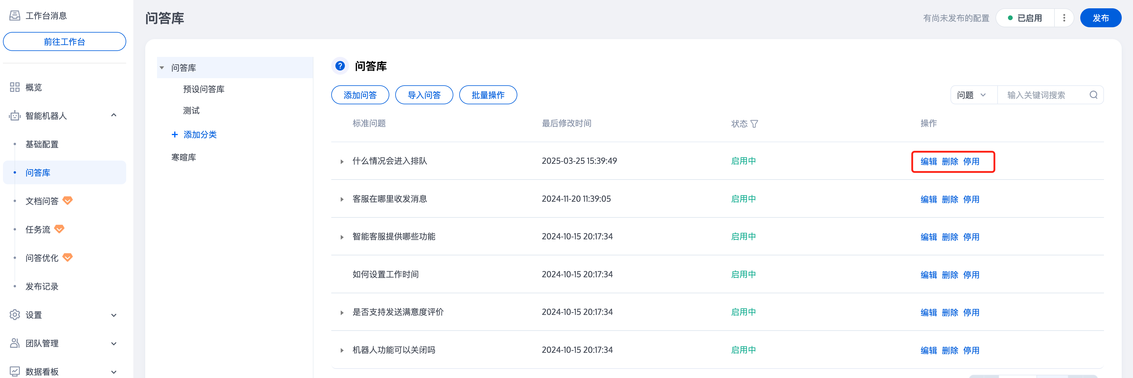 问答上传后,您可以在问题右侧的操作区域,对问答进行编辑/删除/停用/启用操作。如需批量操作,您也可以通过单击问答库下方的批量操作,批量操作选定的问答。