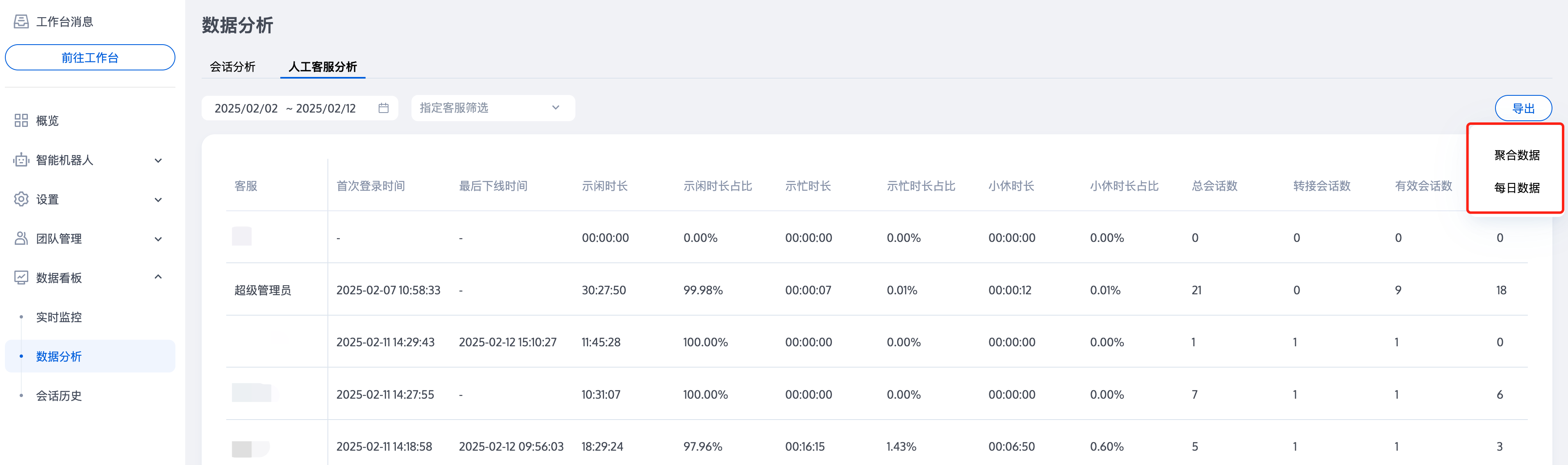 人工接待量 | 指定时间范围,客服接待的会话数量总和。 |