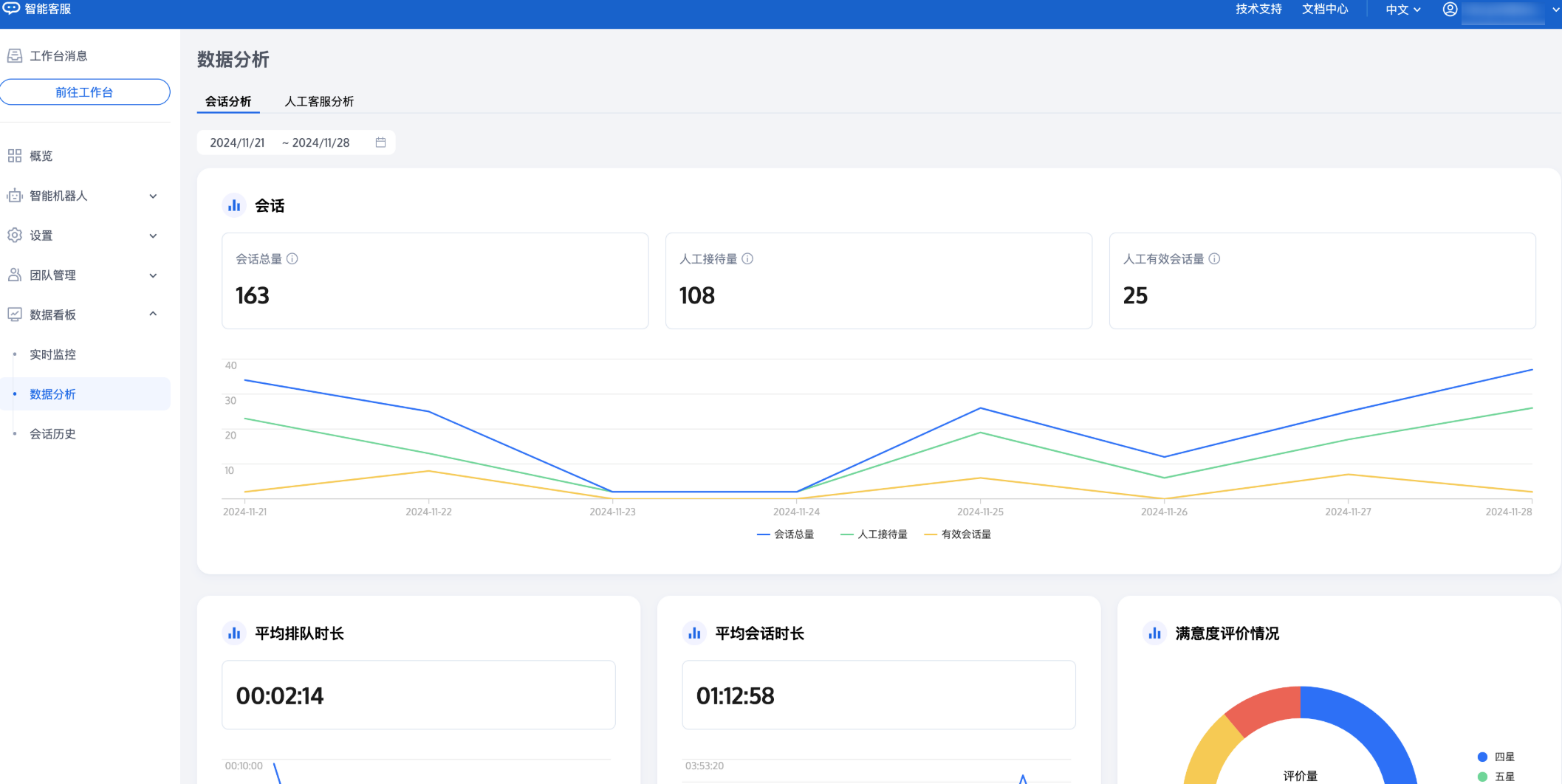 满意率 | 指定时间范围,满意度在 4 星及以上的会话数量/已评价会话数。 |