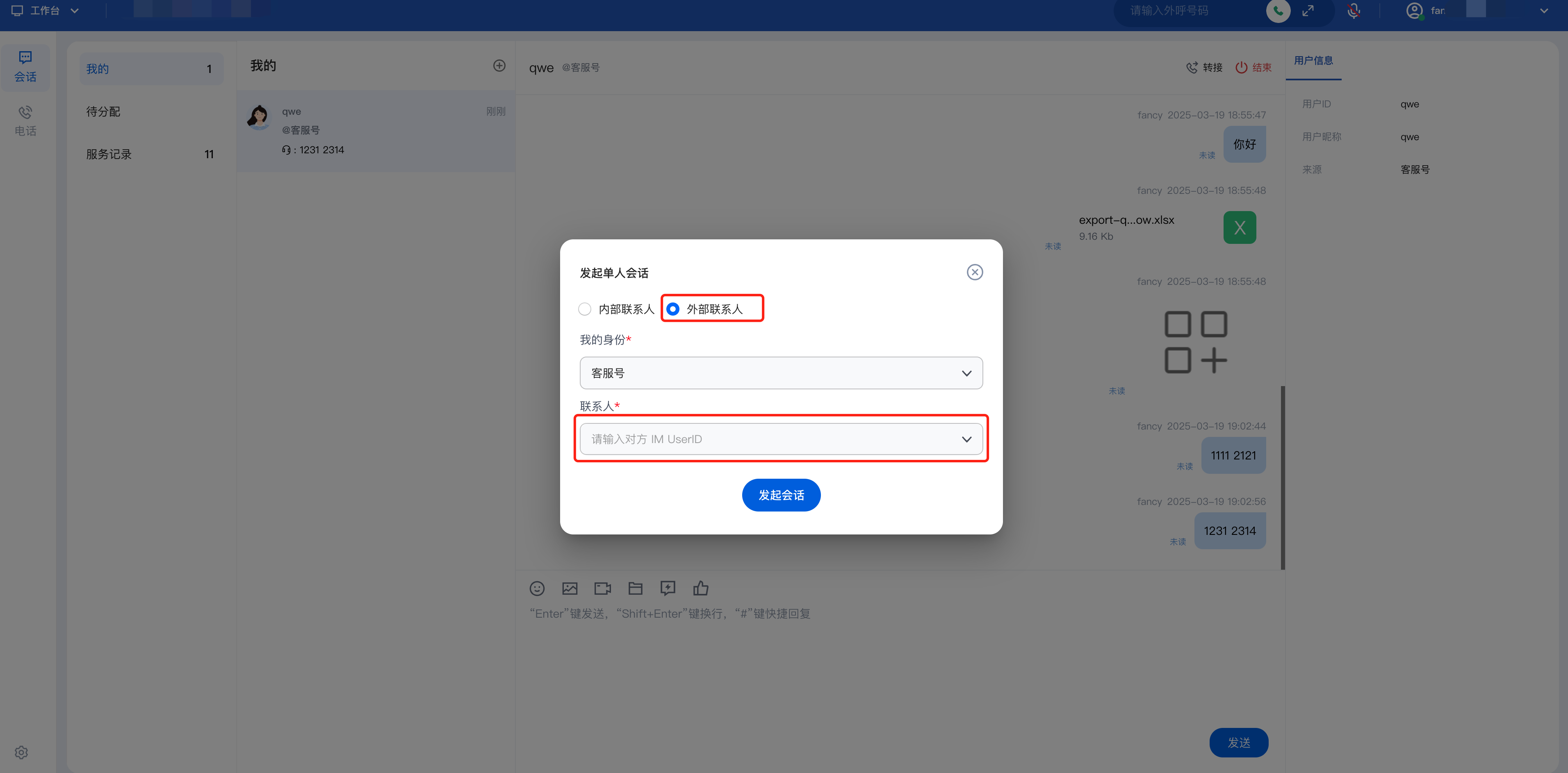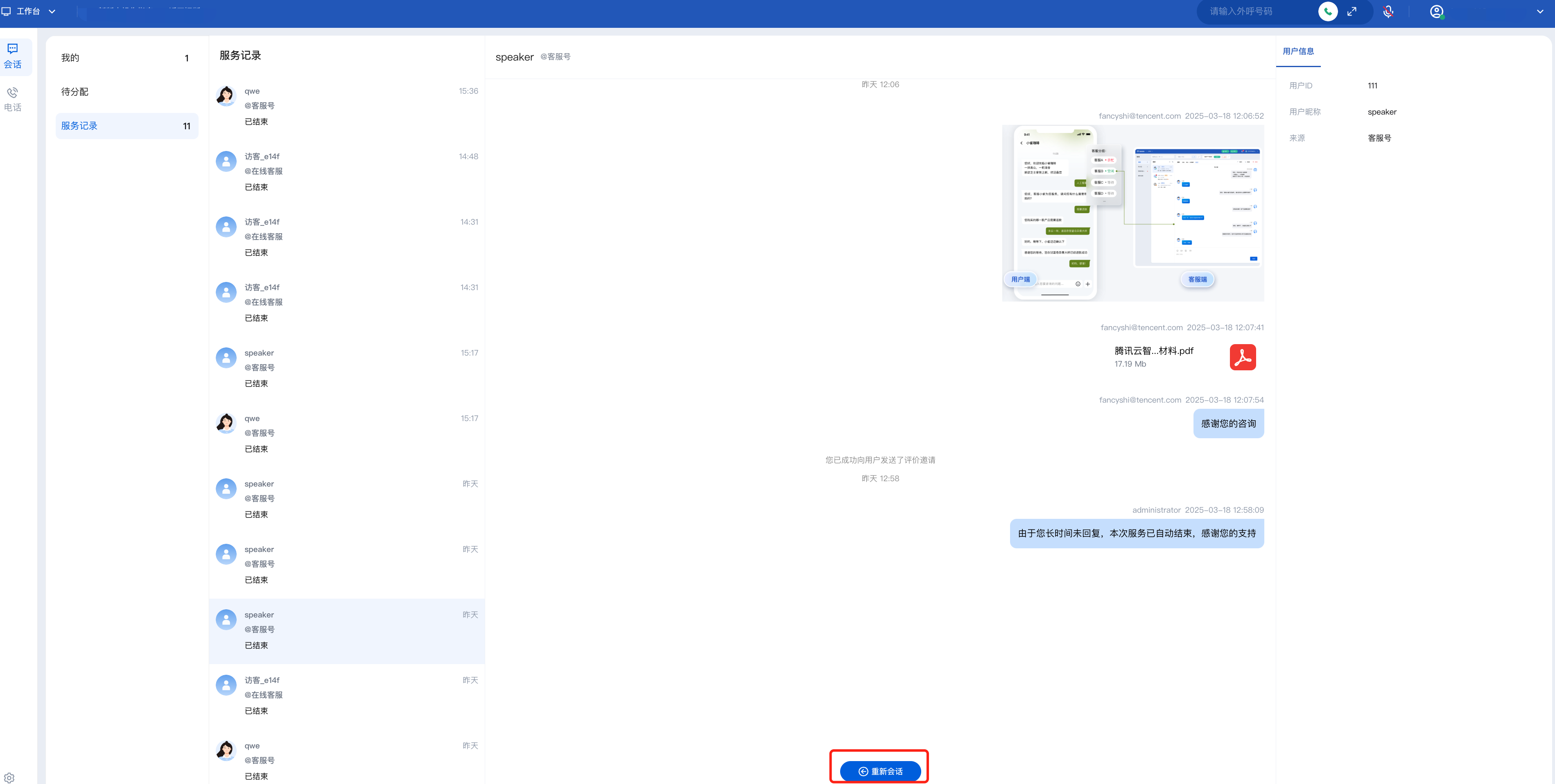 员工可以通过服务记录重新发起会话或通过 UserID 主动联系用户。