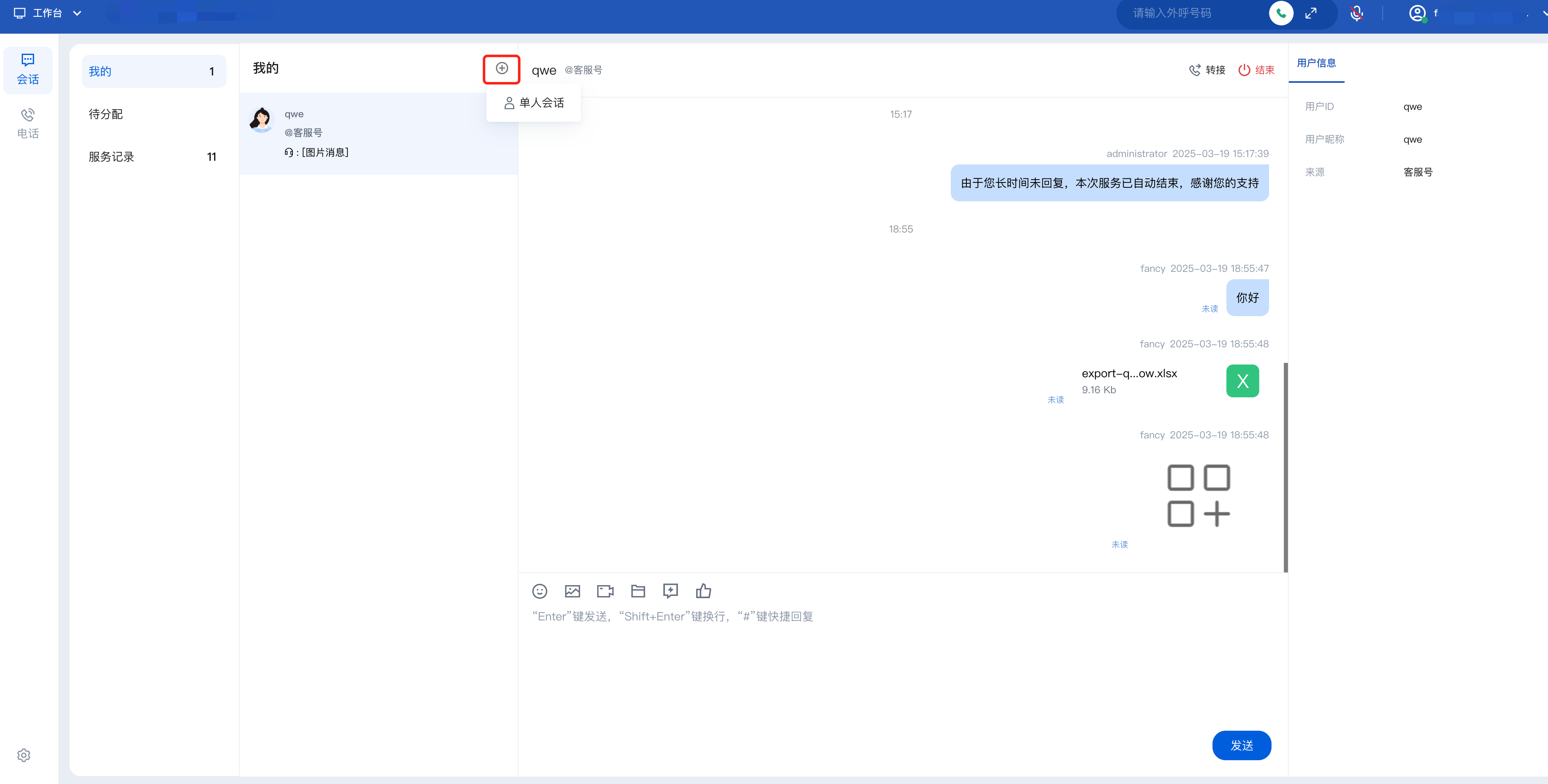 后,将打开和该用户的新会话窗口。