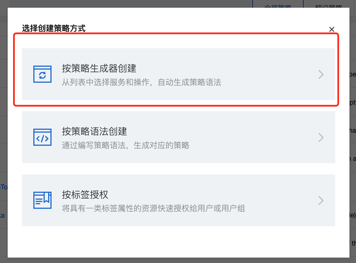 1. 前往 访问管理,左侧导航栏单击策略 > 新建自定义策略, 2. 在创建策略弹窗中,选择按策略生成器创建。