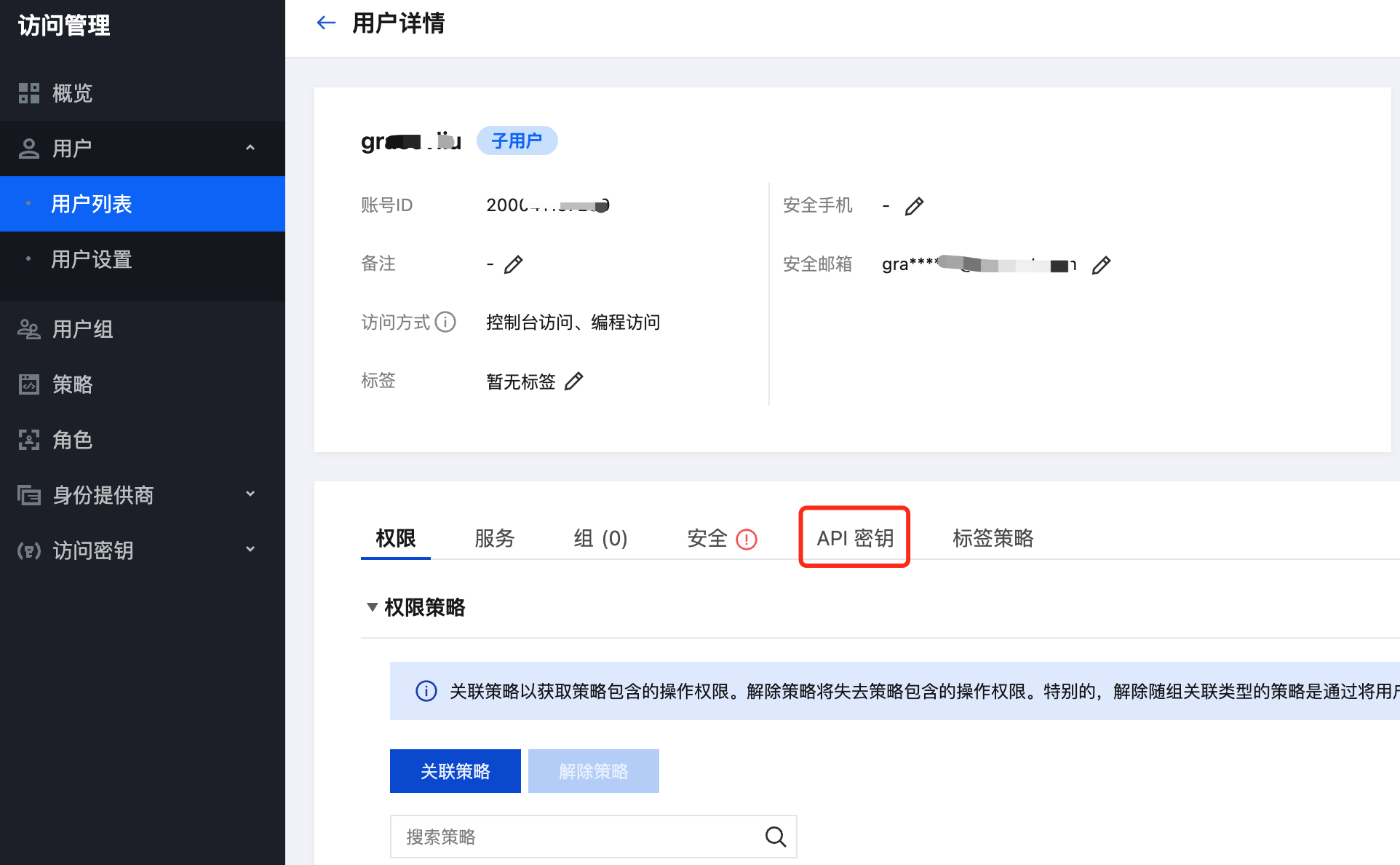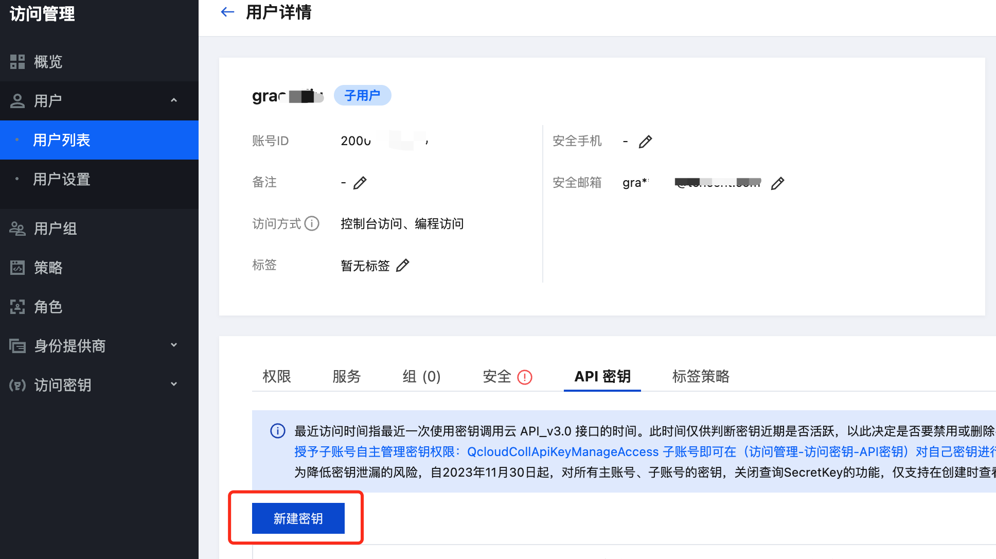 1. 访问管理左侧导航栏单击用户 > 用户列表,点击新建的用户名称,进入用户详情页,点击 API 密钥。 2. 点击新建密钥,获取 Secretld 和 SecretKey 。
