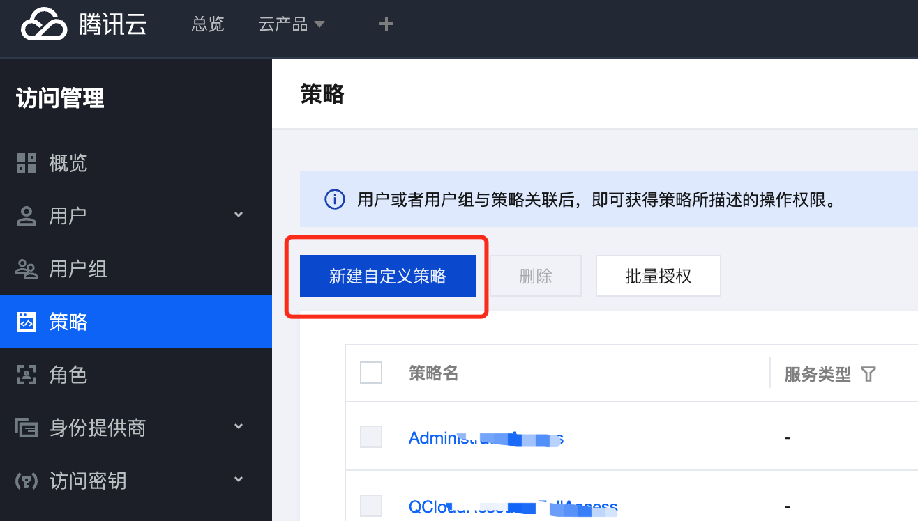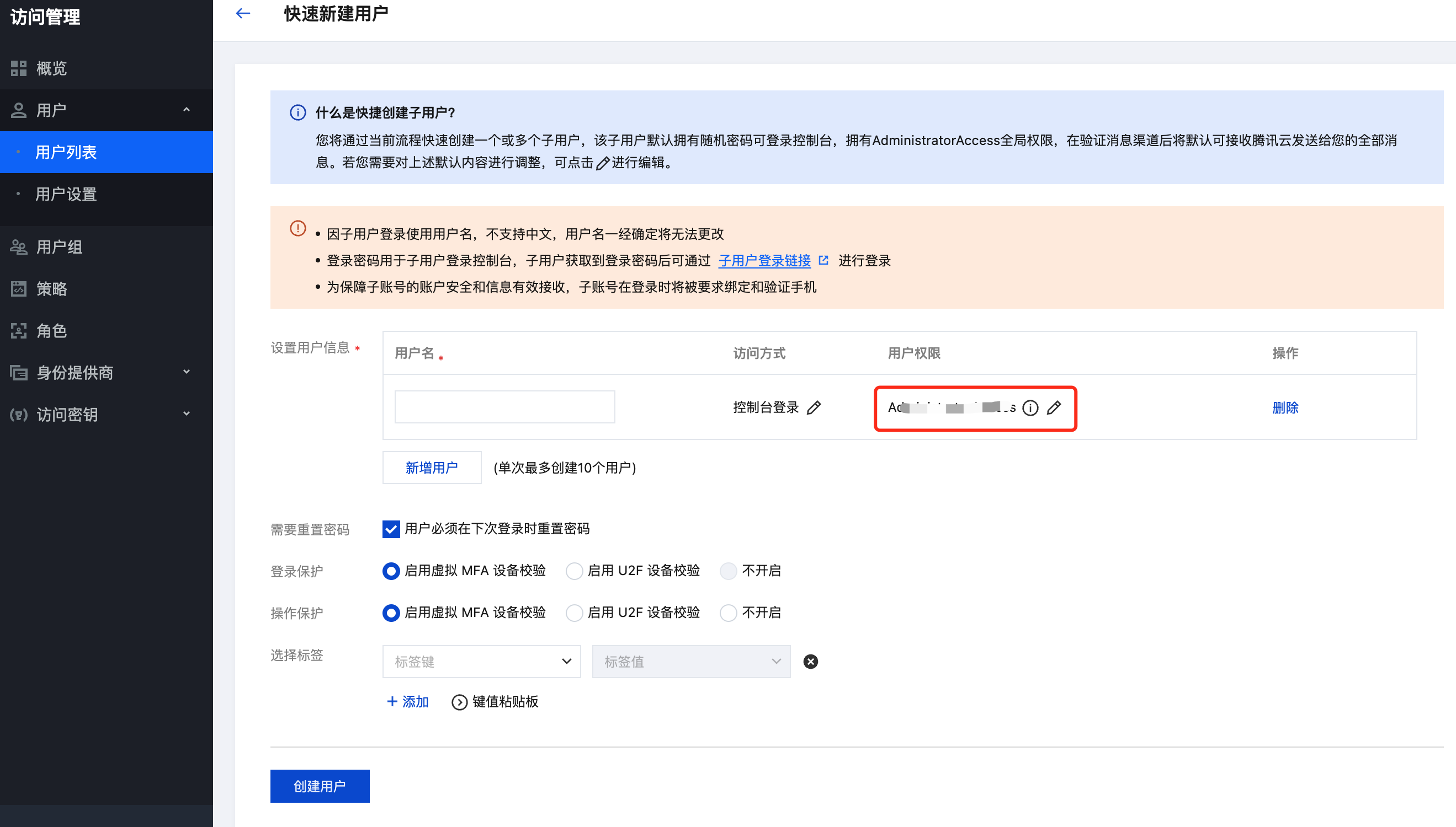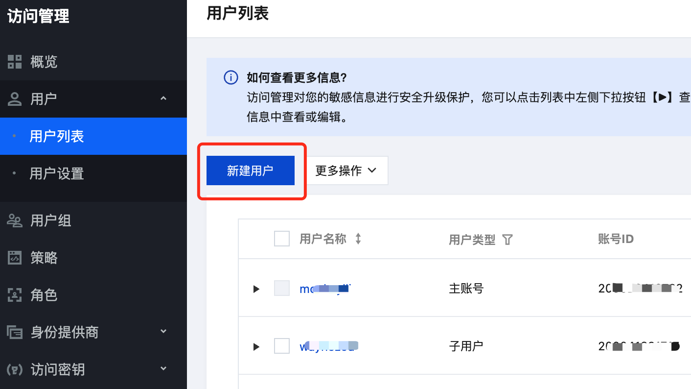 1. 访问管理 左侧导航栏单击用户 > 用户列表 > 新建用户。 2. 为新建用户绑定策略。
