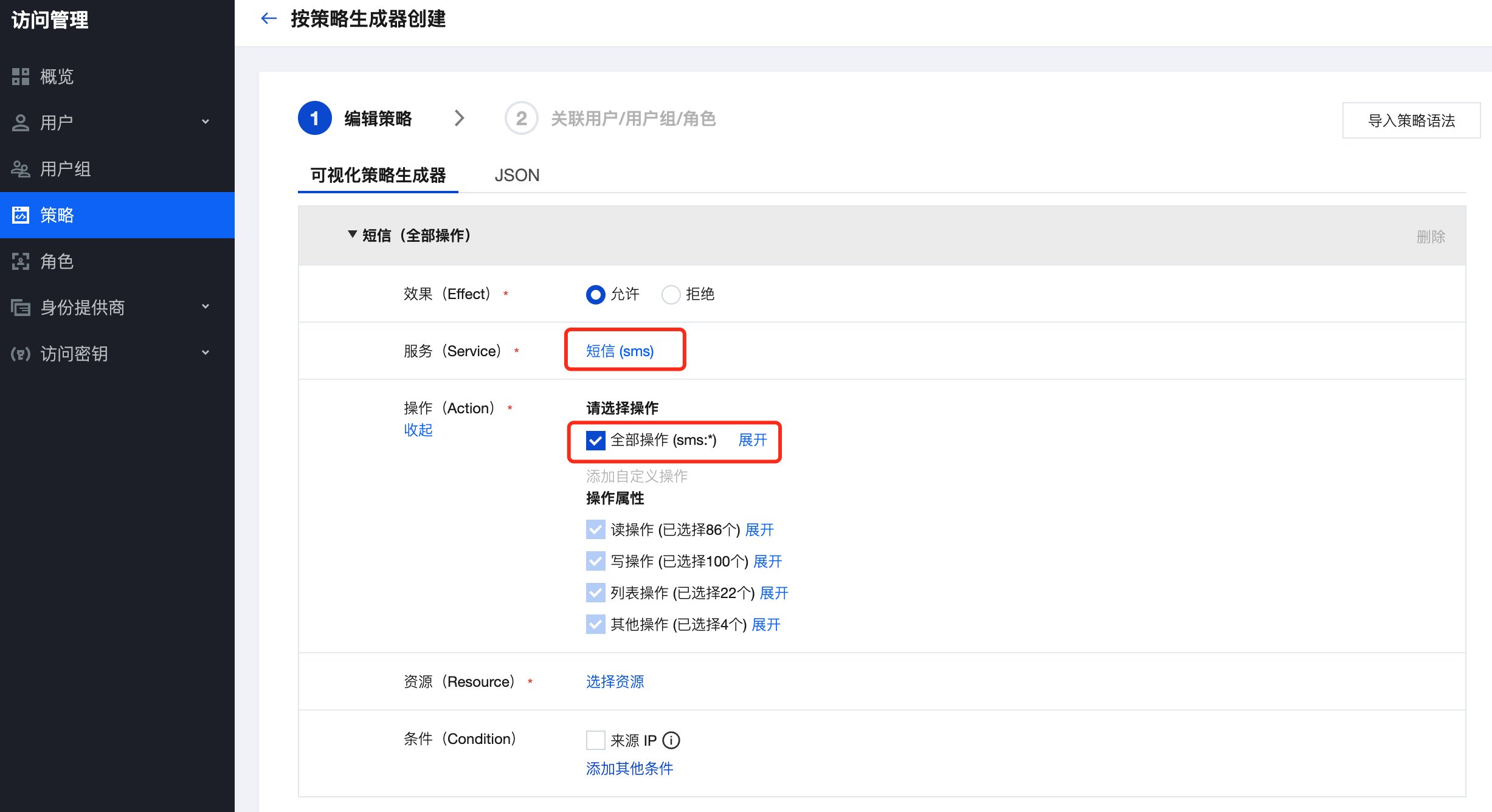 3. 在可视化策略生成器中,选择短信服务,勾选全部操作,选择全部资源。