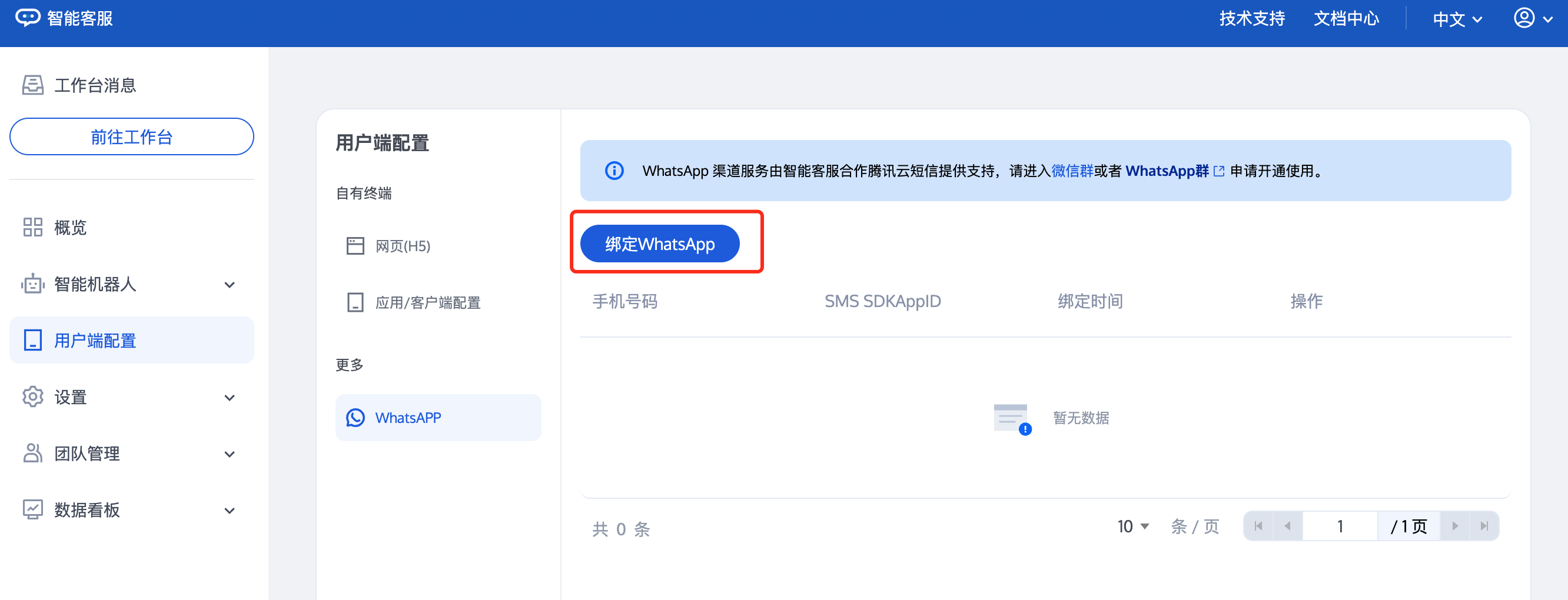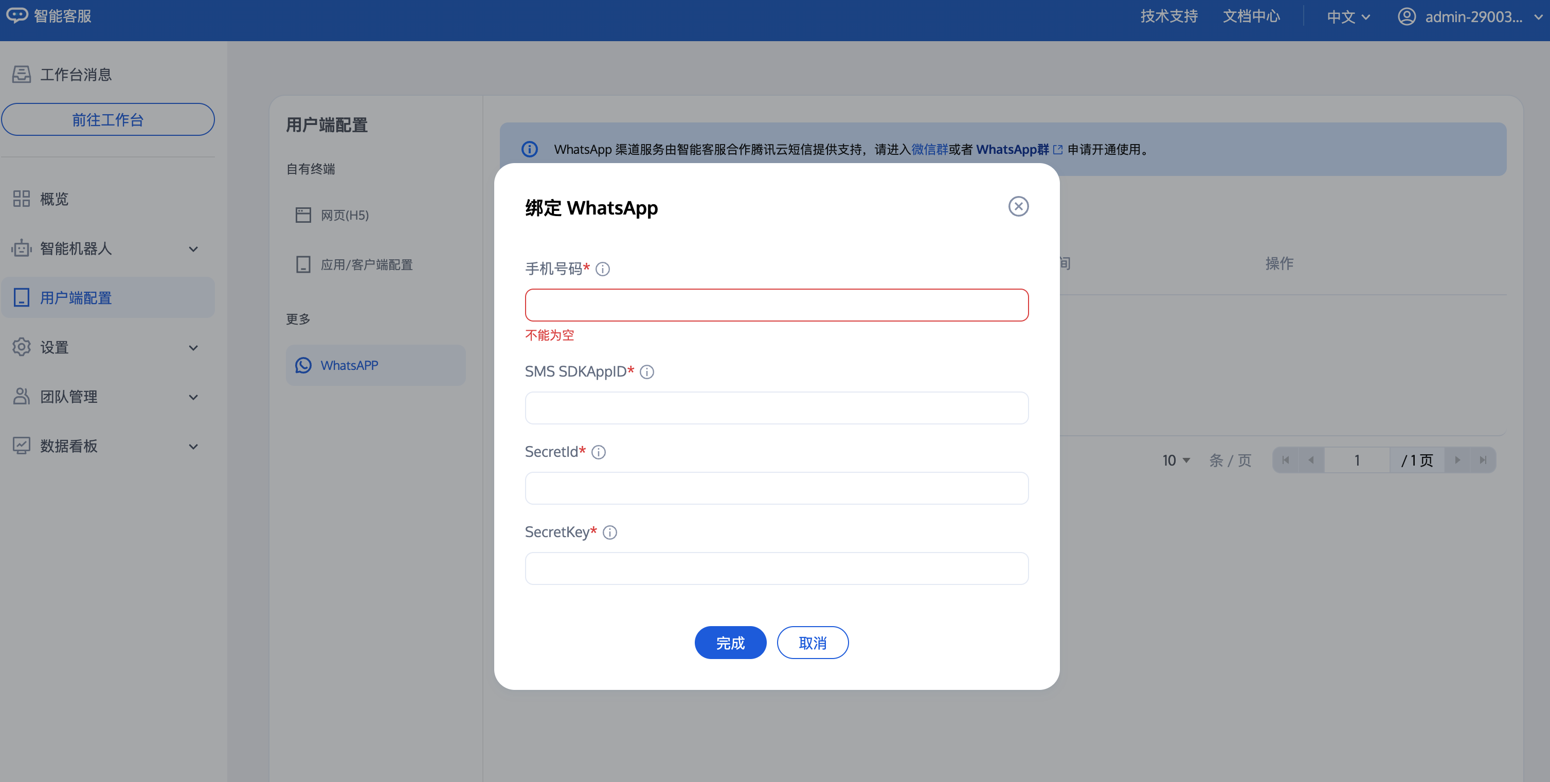 2. 开通后,请按照 接入流程 完成在腾讯云短信控制台的配置。 3. 在腾讯云短信控制台完成配置后,访问管理端,左侧导航栏单击用户端配置 > WhatsApp,单击绑定WhatsApp。 4. 在弹窗中,正确填写所需信息: