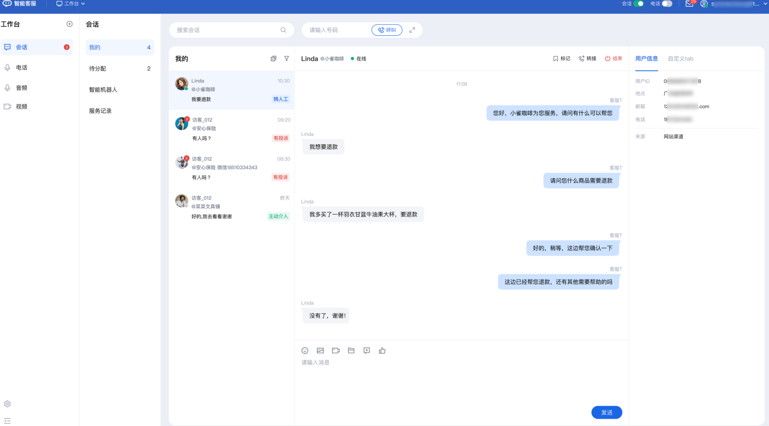 工作台:提供免开发、SDK 嵌入两种接入方式,一端处理全渠道咨询