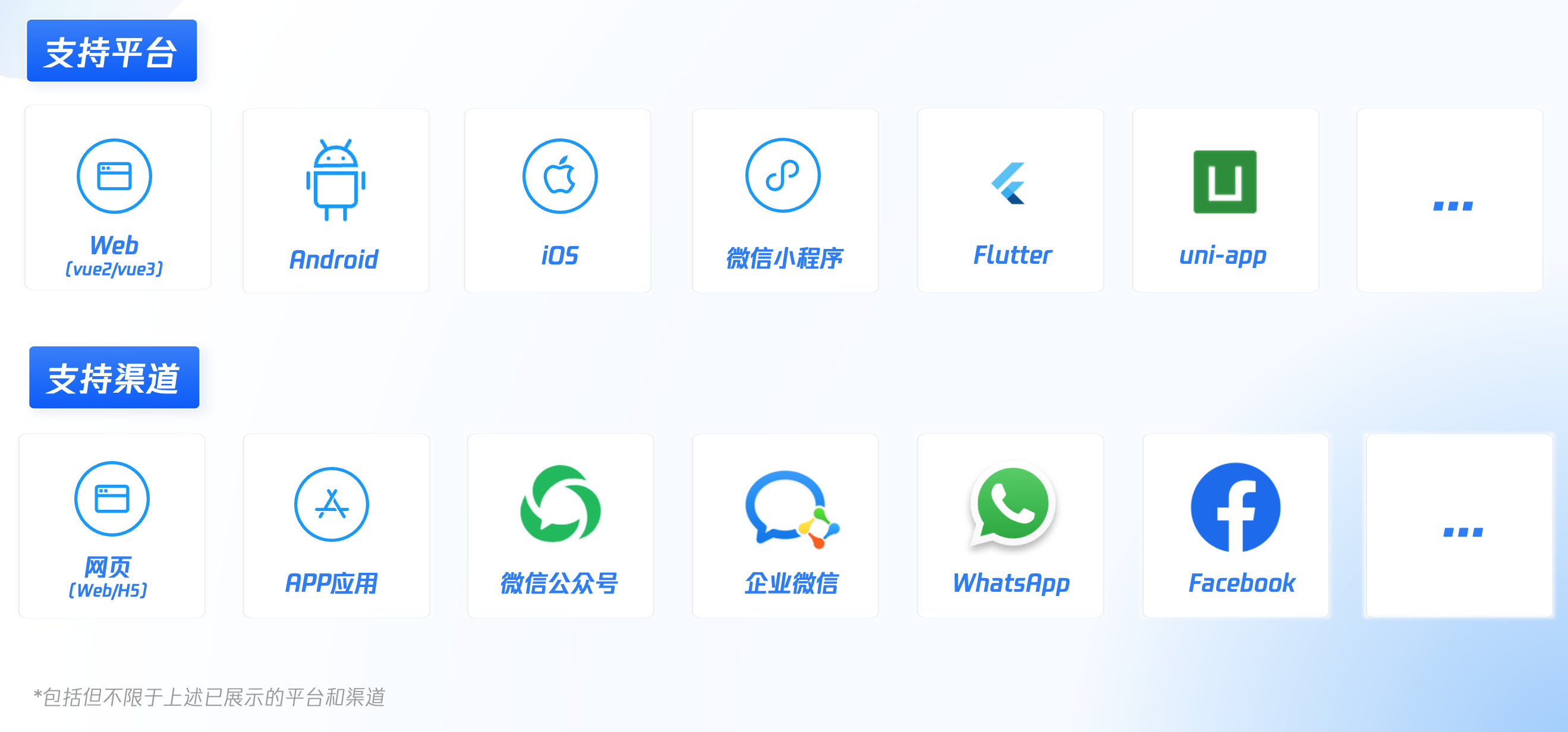 支持渠道:Web/H5、App、企业微信、微信公众号、WhatsApp、Facebook。