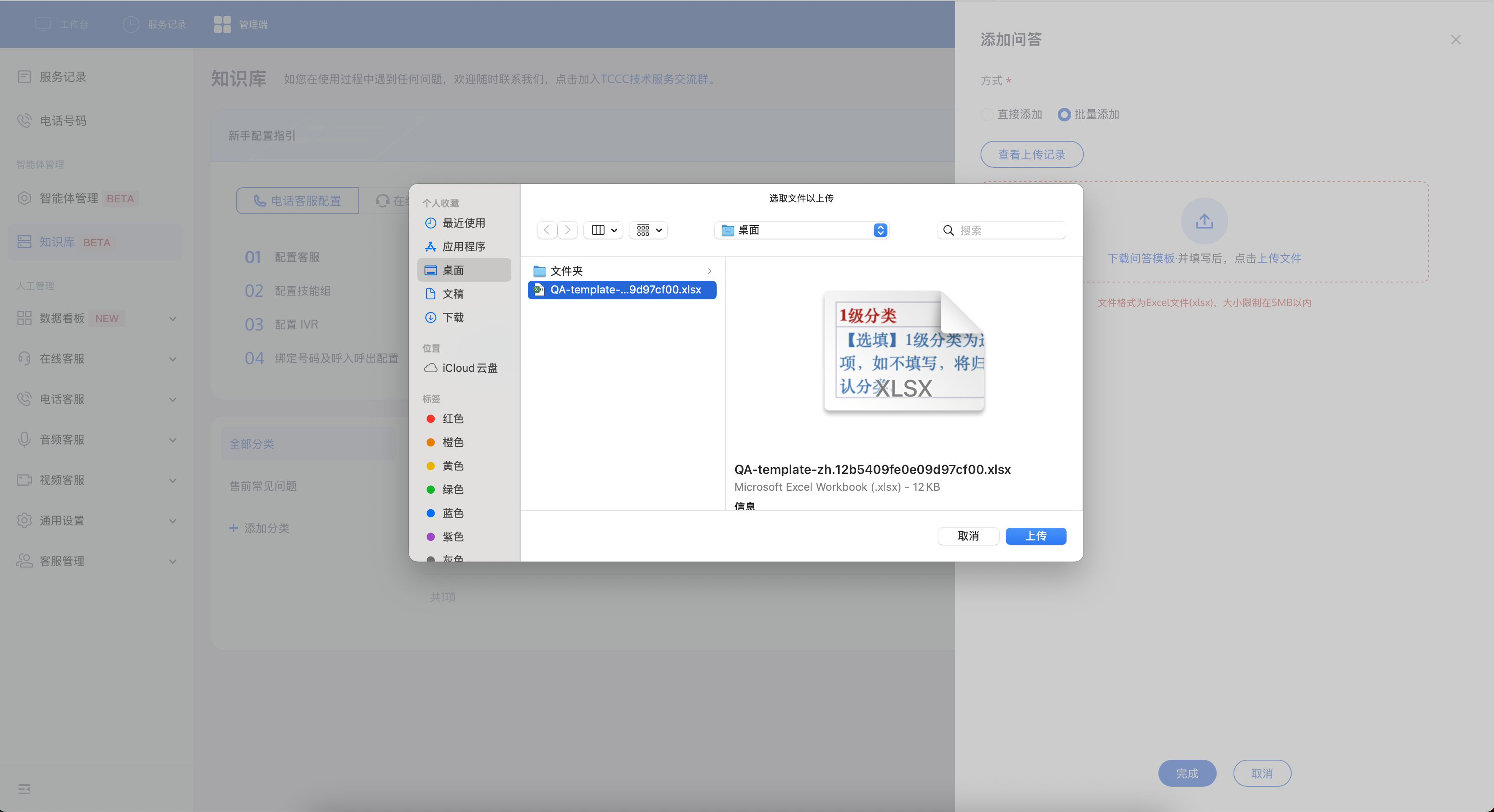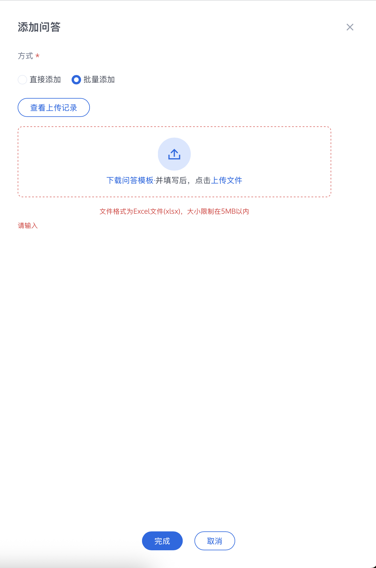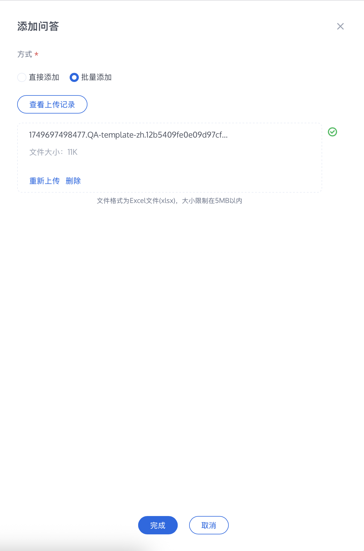 步骤4:保存完毕后,在添加问答页面,单击上传文件,上传您保存的问答模版即可。
