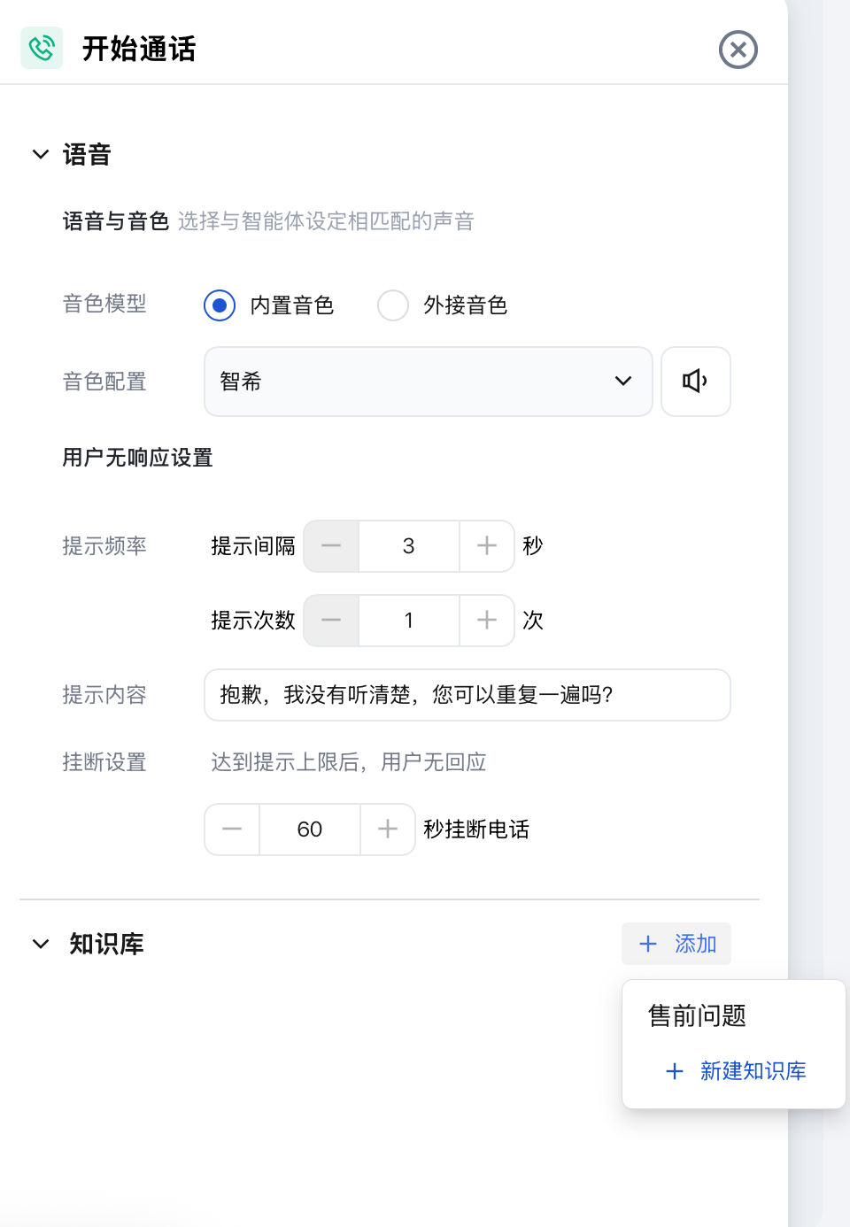 2. 在开始通话设置中,单击知识库旁的+添加按钮,选择需要关联的知识库。当通话中用户提问命中知识库预设问题时,系统将自动调用对应答案进行回复,回答完成后会继续执行原定对话流程。