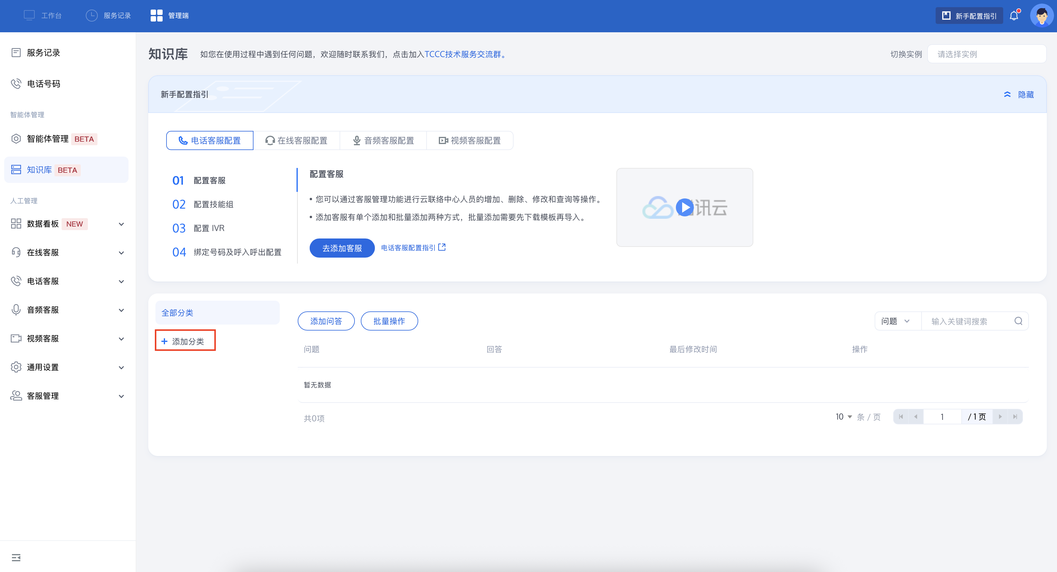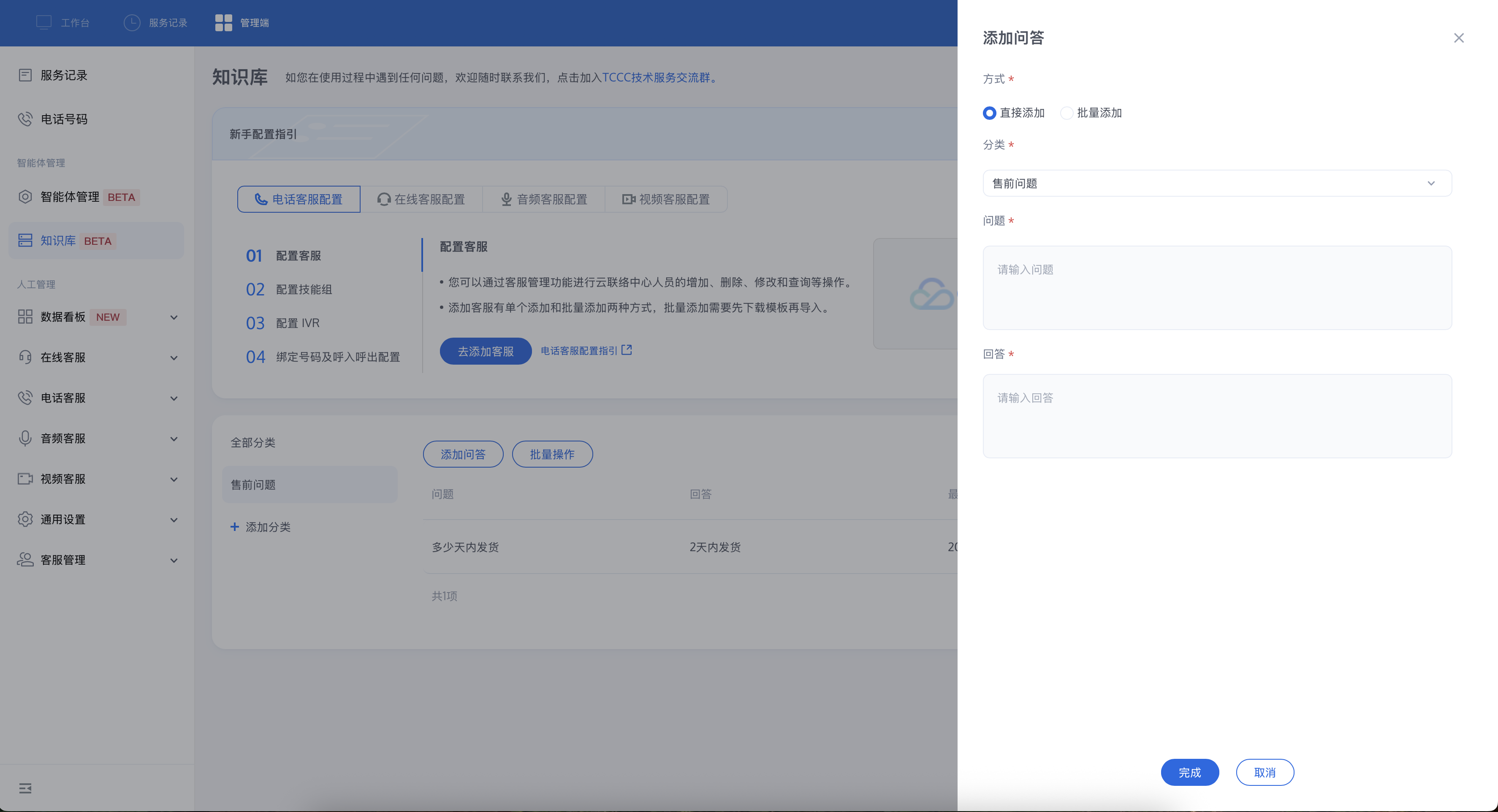 2. 添加分类后,您可以单击添加问答并进入添加问答设置页面。方式可选择直接添加或批量添加文件。
