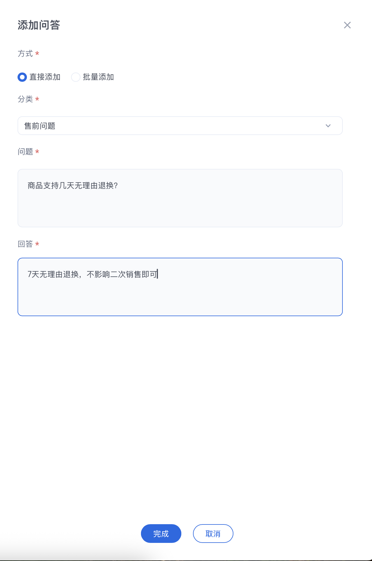 如果您选择直接添加,需填写具体问题和对应回答(例如问题"商品支持几天无理由退换?",回答"7天无理由退换,不影响二次销售即可"),编辑结束后单击下方完成键即保存成功。