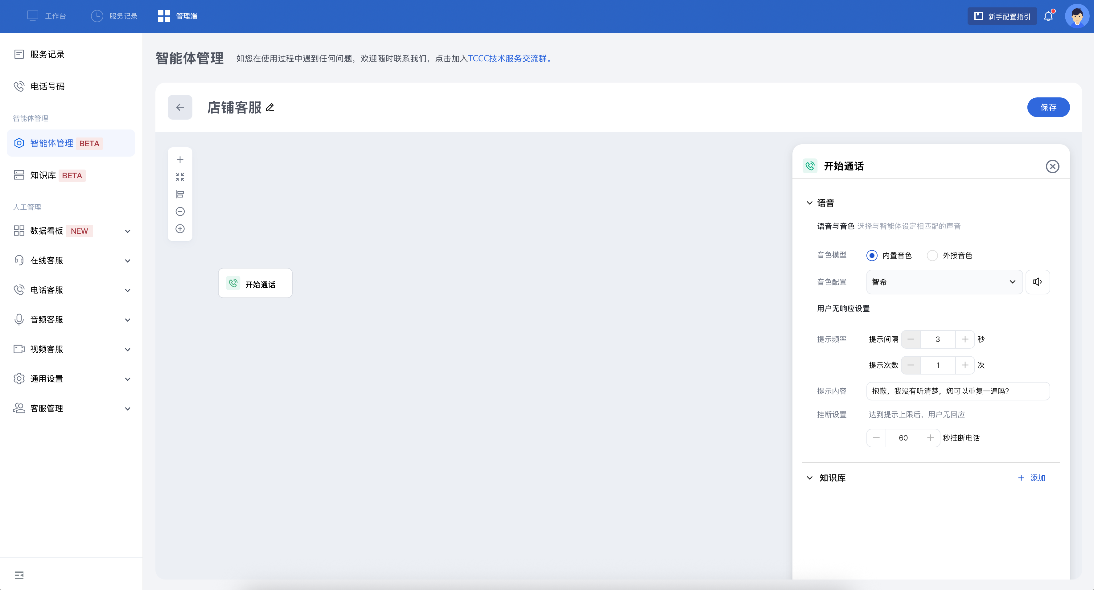 1. 添加问答之后,左侧导航栏选择智能体管理,选择您所需要绑定知识库的智能体(例如:“店铺客服”),单击开始通话,即可在右侧看见开始通话设置。