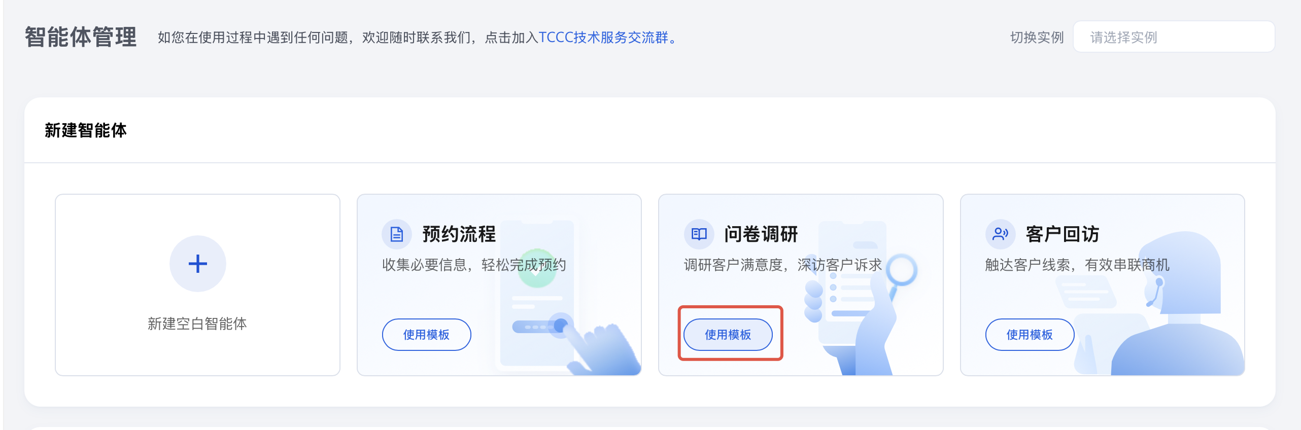 2. 智能体管理提供了预约流程、问卷调研、客户回访等三个业务场景模板供您参考,您只需单击使用模板即可快速创建。如果没有适合您的业务场景,且您不熟悉根据大模型提示词来编写语音智能体,建议您使用“问卷调研”模板来创建智能体,在后续页面中可以修改模板的提示词。如果您非常熟悉提示词编写,您也可以直接单击新建空白智能体从0开始创建。