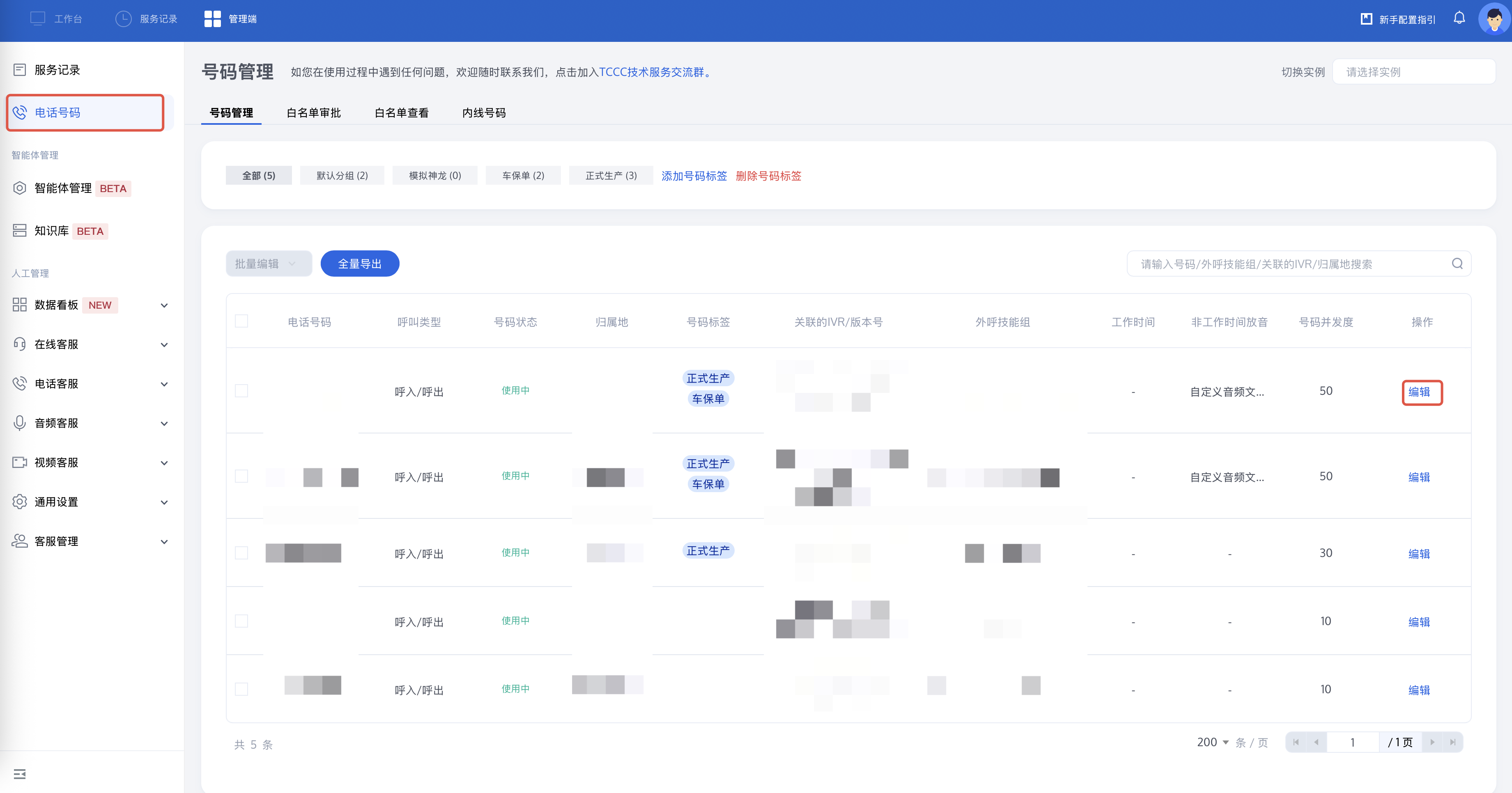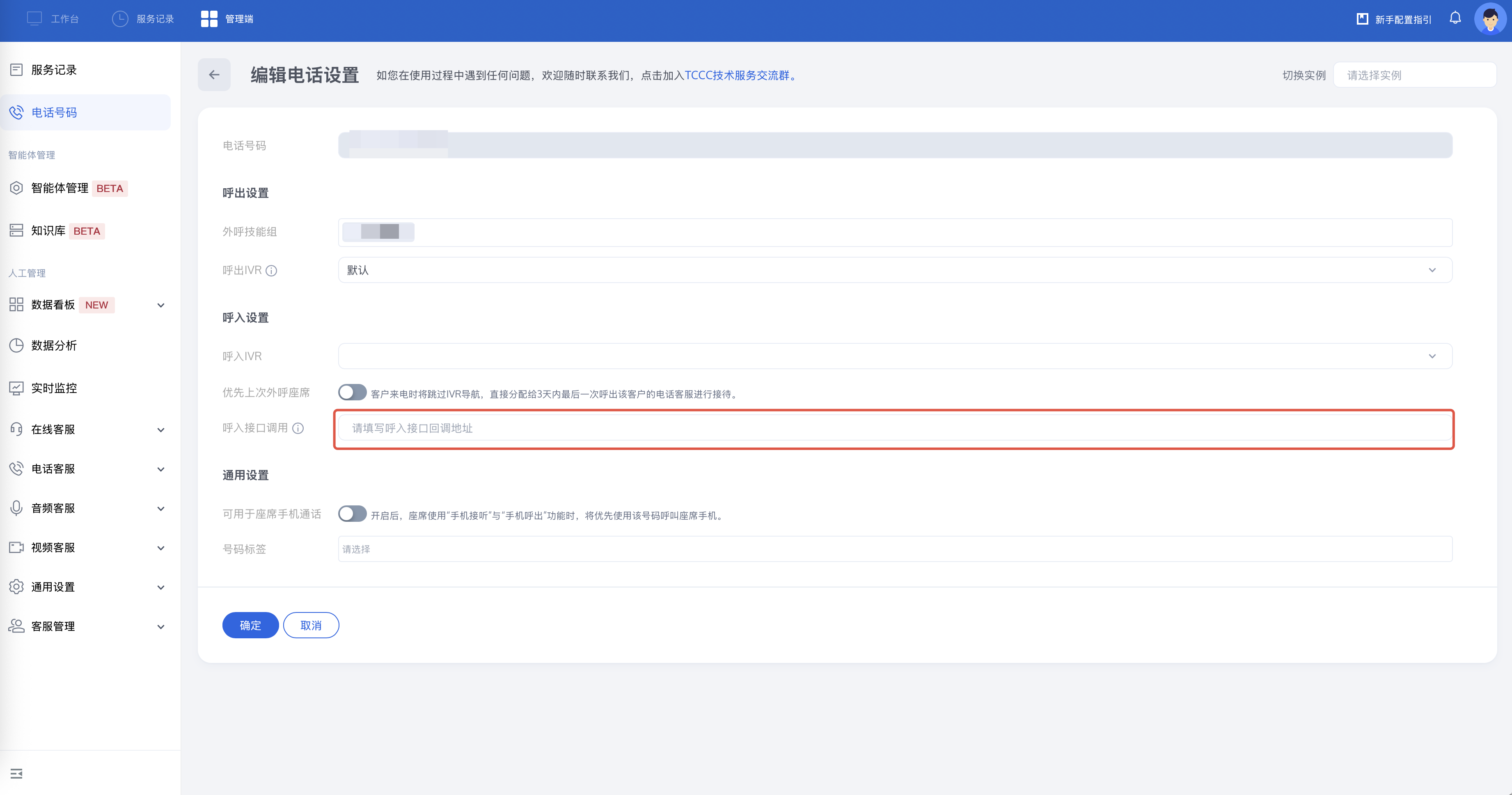 进入编辑电话设置页面,在呼入设置 > 呼入接口调用中填写接回调地址,并单击确定保存生效。