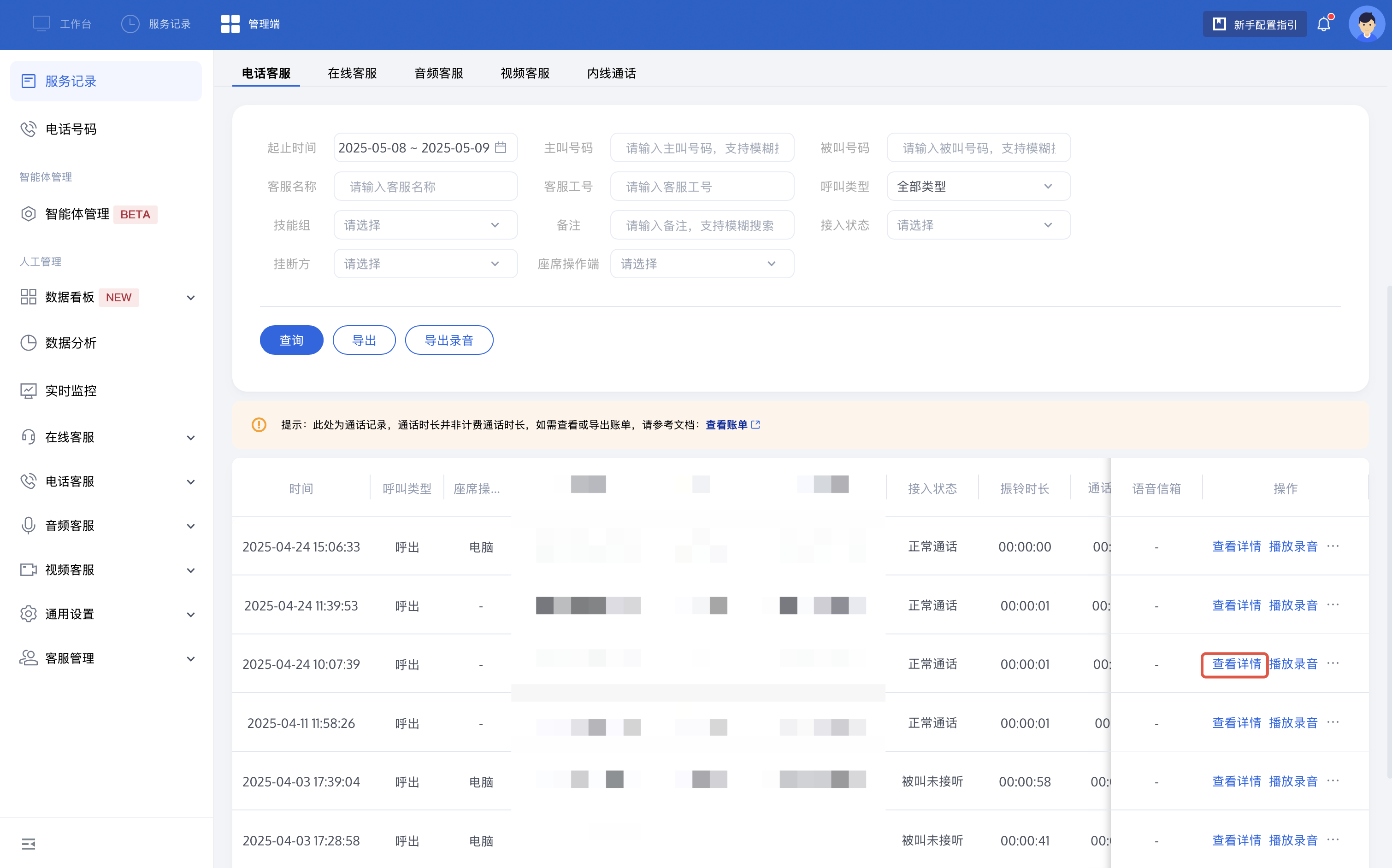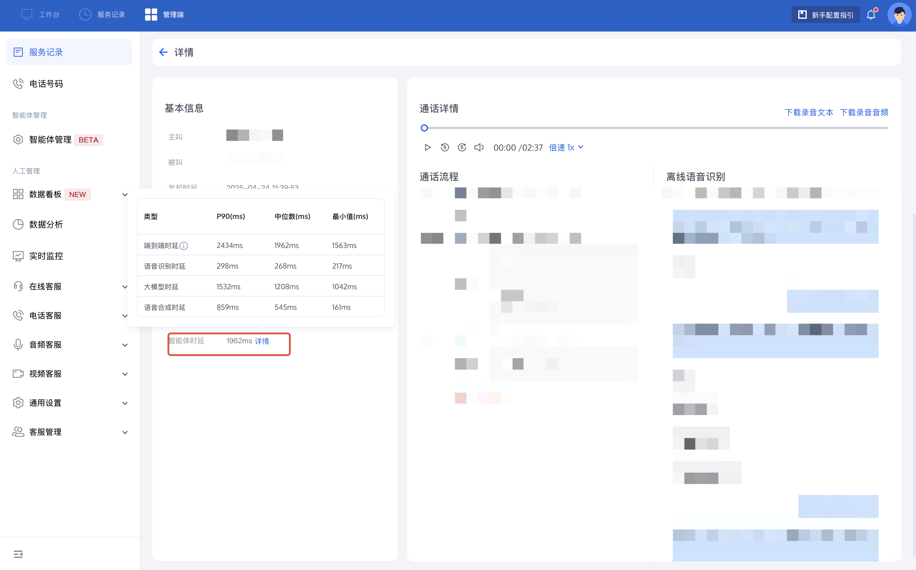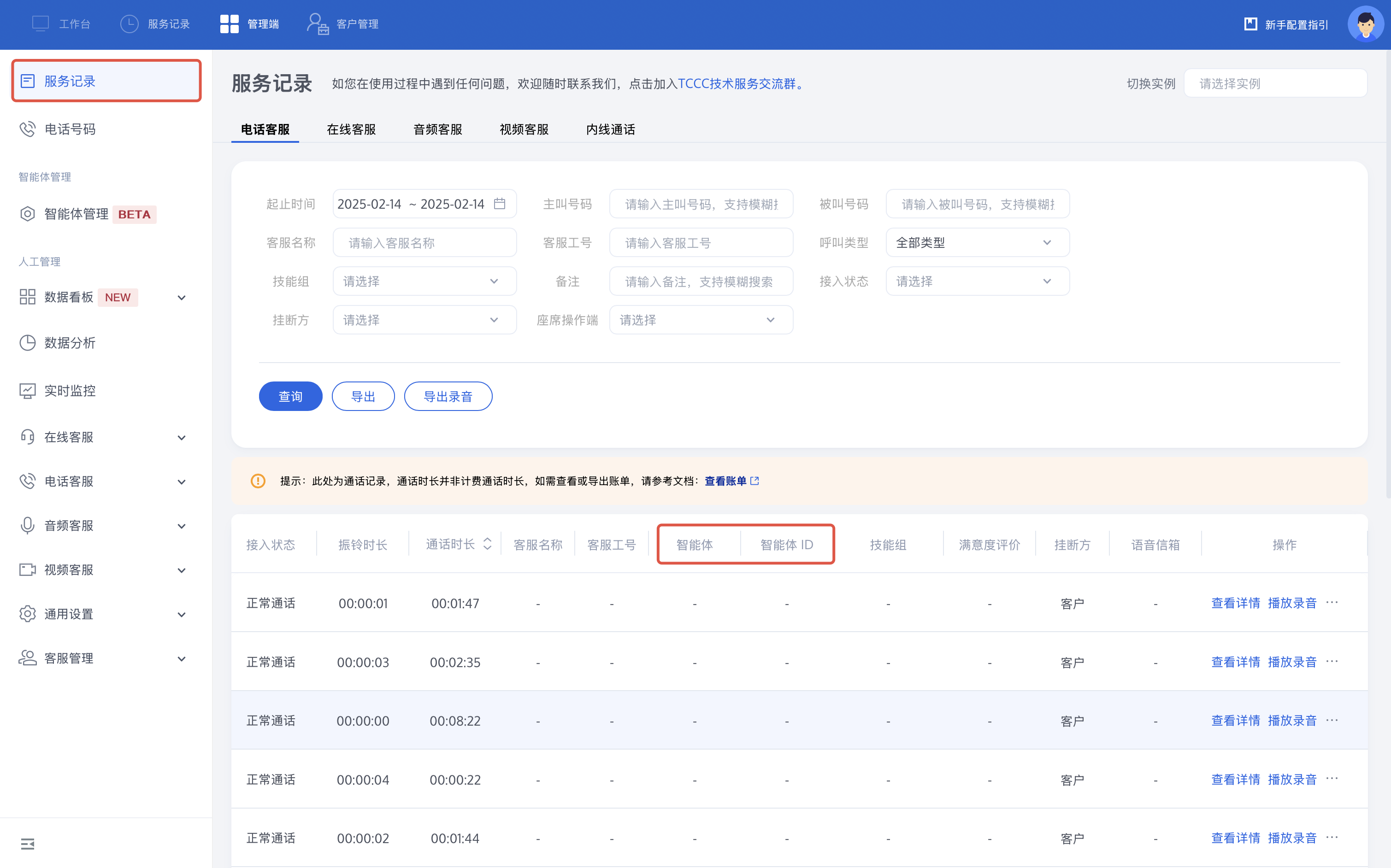智能体通话结束后,您可在服务记录中直接查看通话记录和录音,具体查看方法可参见
