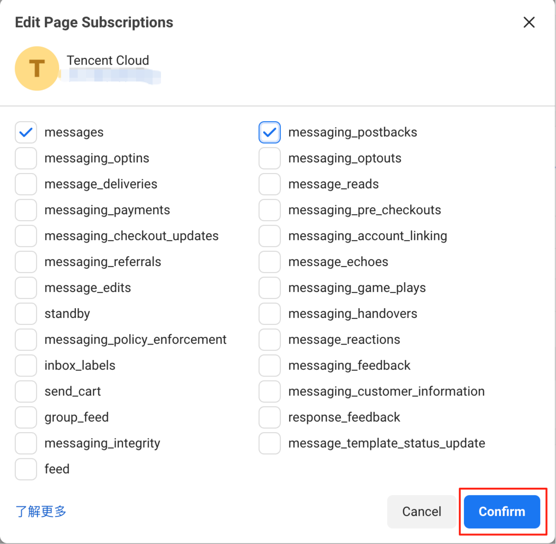 3.1 选择订阅 "messages" 和 "messaging_postbacks",单击确认后就顺利完成渠道接入。