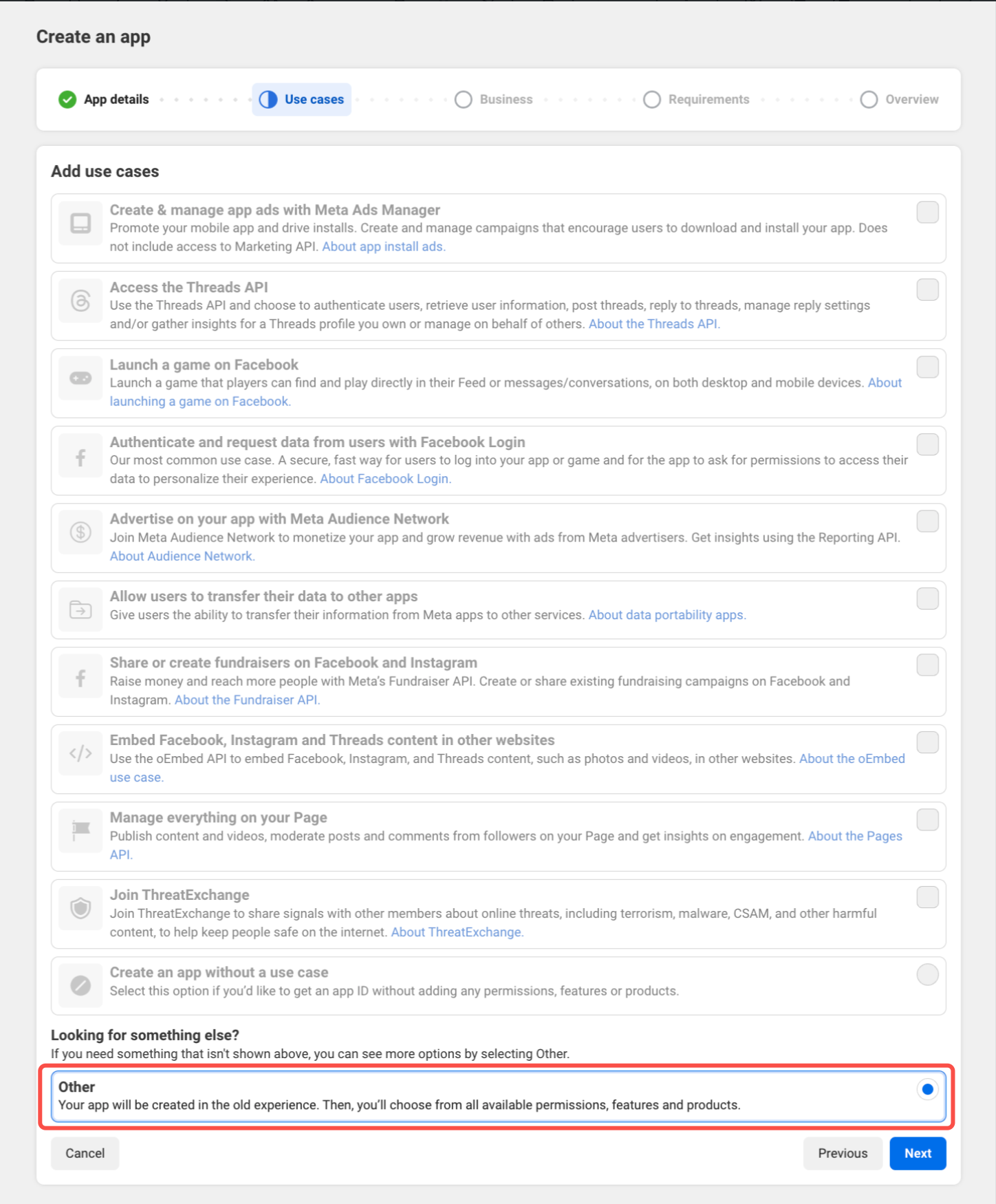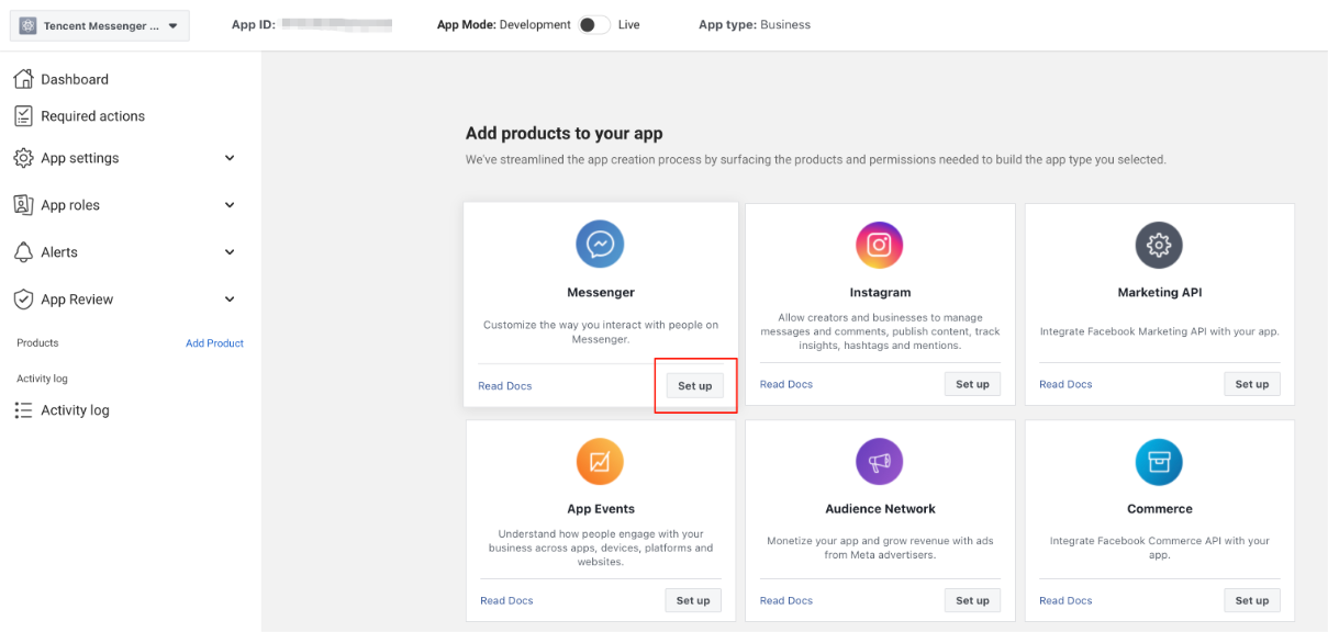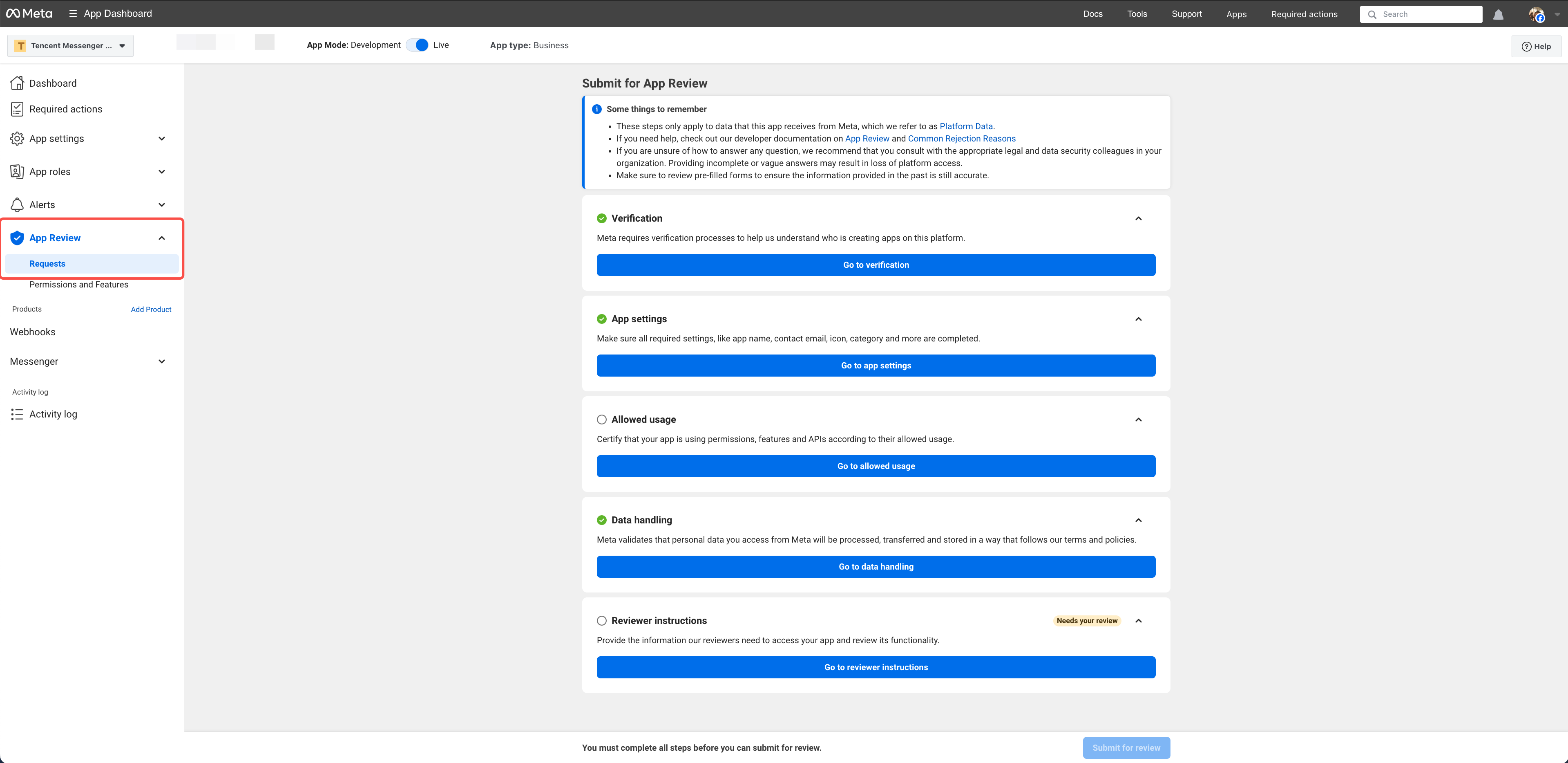 1. Meta 开发者平台 选择您的应用,在 Messenger API 设置 > 应用审核,完成页面消息权限审核后智能客服才可接入您的消息数据。 2. 您需要在 Facebook 页面完成以下应用审核