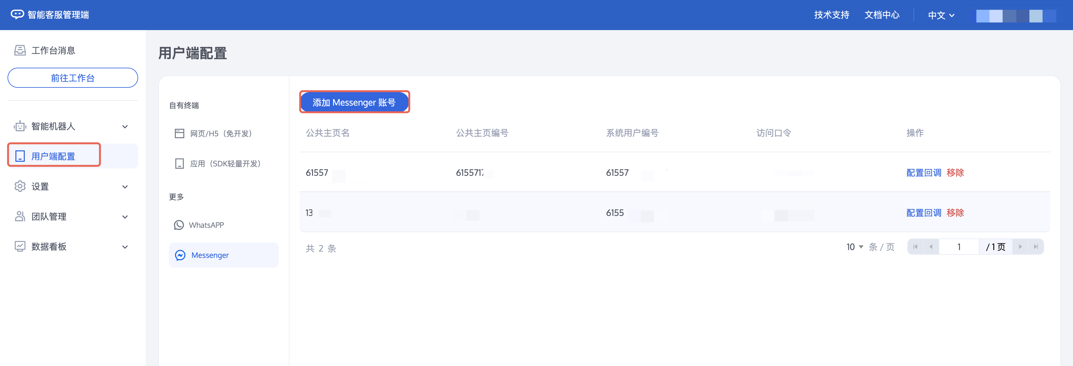 步骤1:添加 Messenger 消息渠道至智能客服管理端