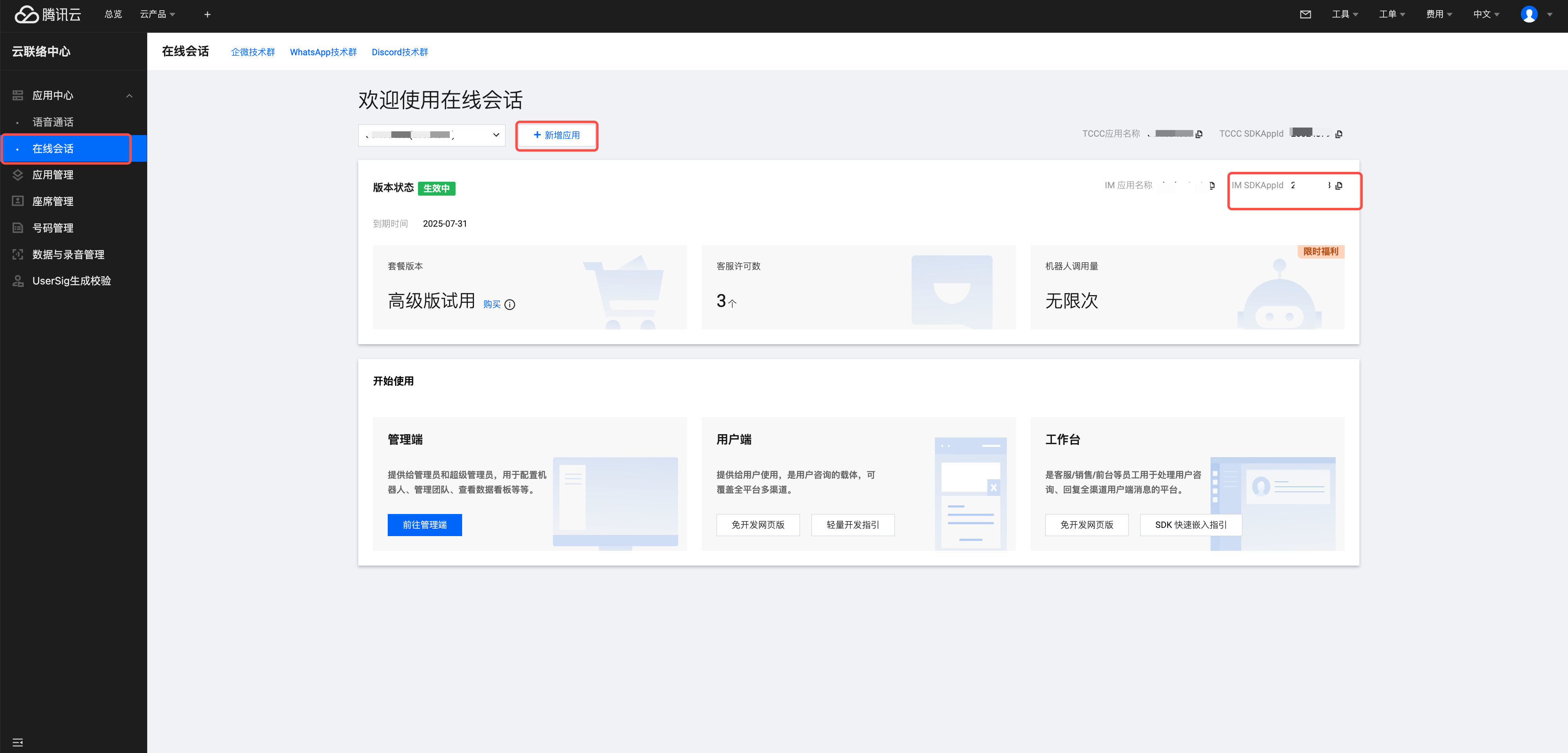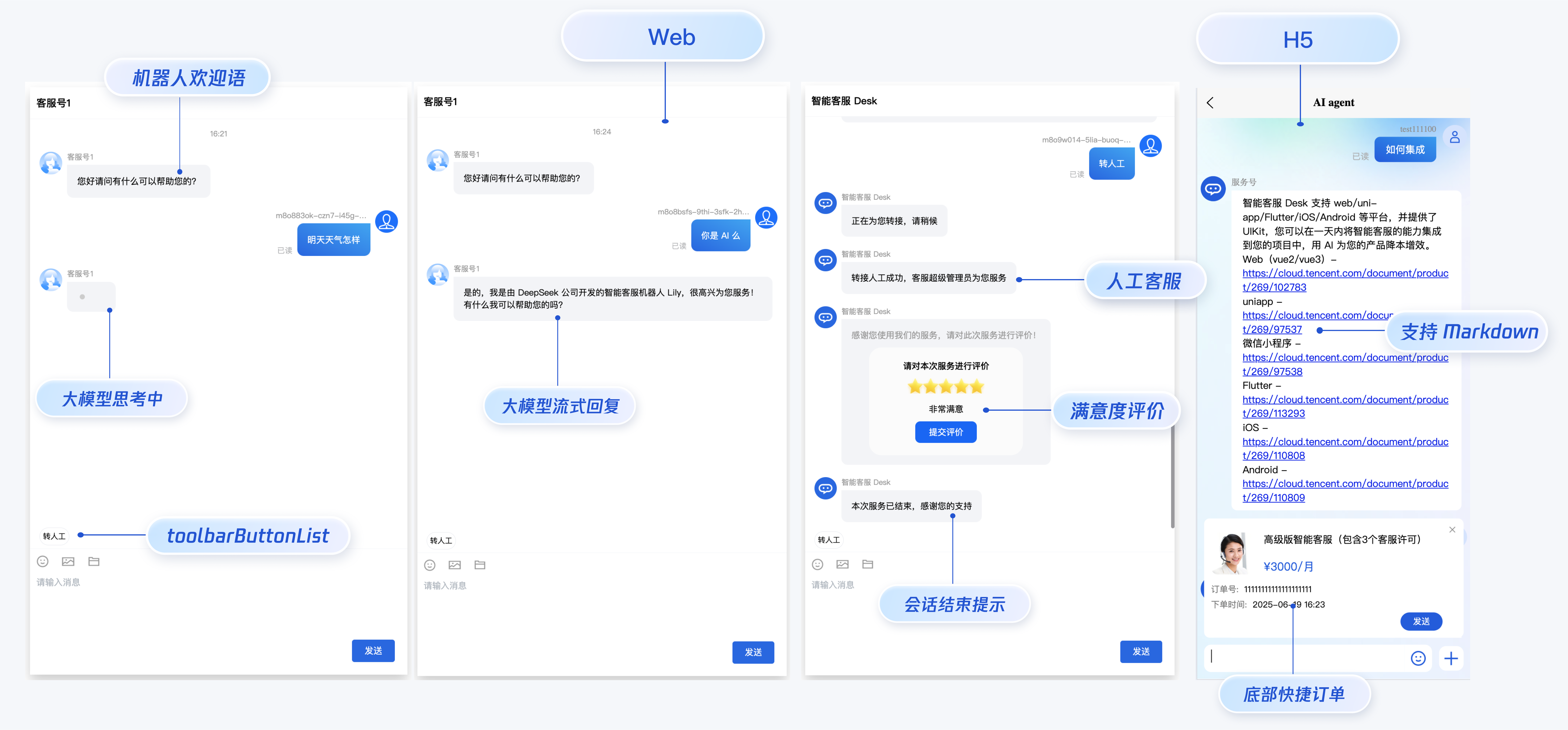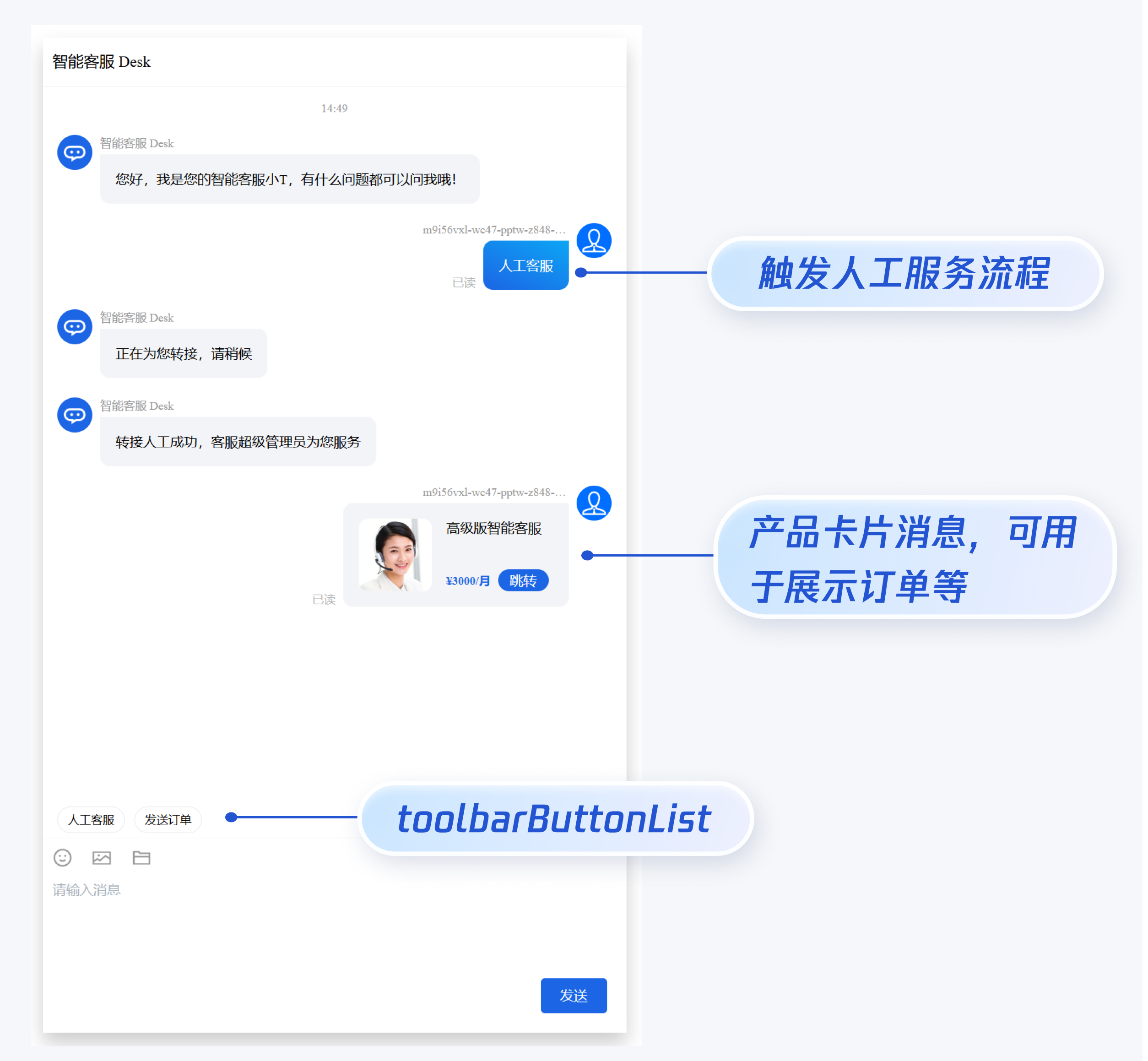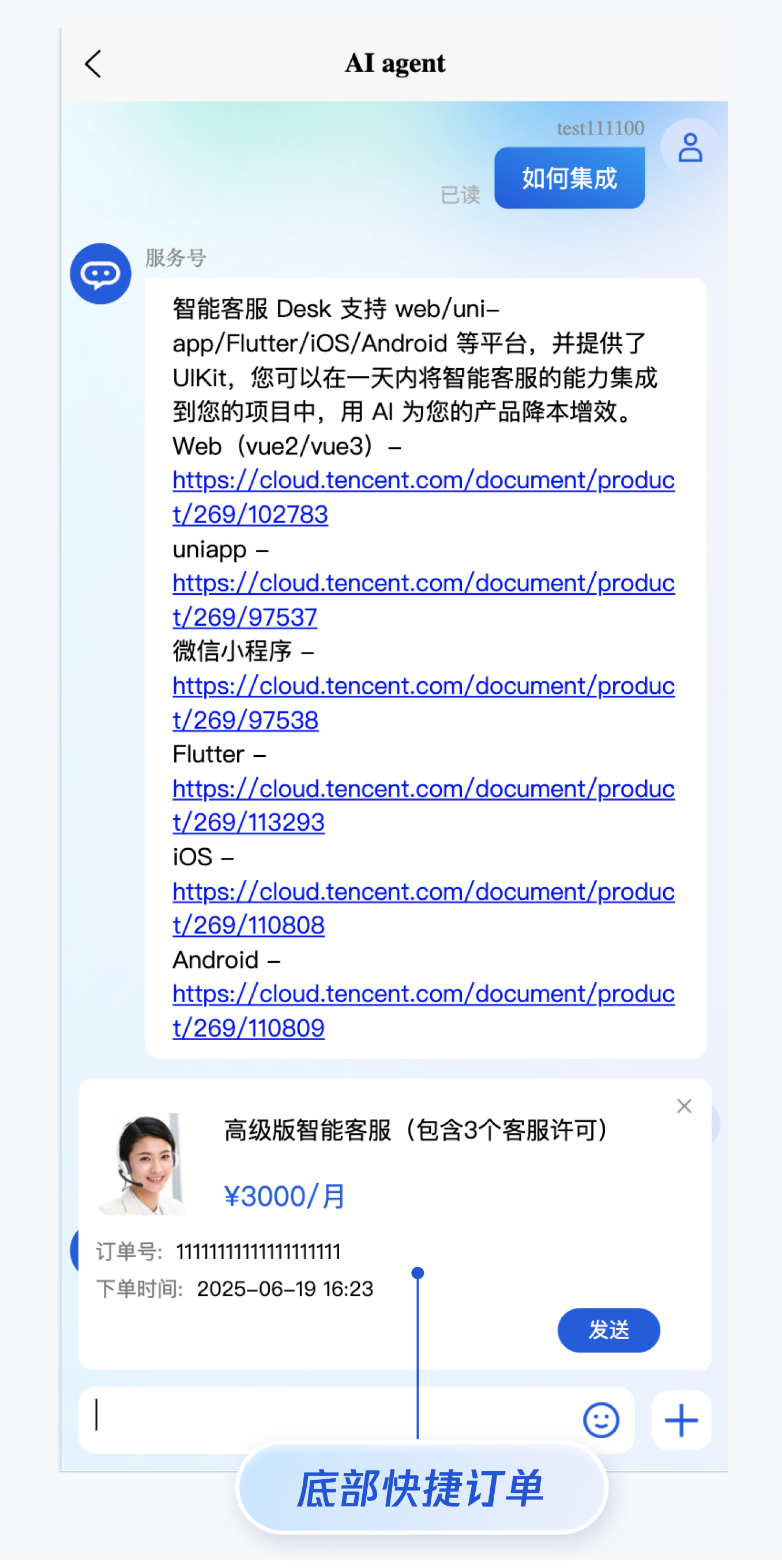<template><CustomerServiceChat:style="{ width: '600px', height: '80vh', margin: '10px auto', boxShadow: '0 11px 20px #ccc' }":bottomQuickOrder="bottomQuickOrder"/></template><script setup lang="ts">import TUICustomerServer, { CustomerServiceChat } from './ai-desk-customer-vue';import { onMounted } from 'vue';const bottomQuickOrder = {header: "高级版智能客服(包含3个客服许可)",desc: "¥3000/月",pic: "https://static.cloudcachetci.com/qcloud/portal/kit/images/presale.a4955999.jpeg",url: 'https://your_url.com',customField: [{name: '订单号',value: '11111111111111111111'},{name: '下单时间',value: '2025-07-02 16:23'}]};onMounted(() => {const SDKAppID = 0; // Your SDKAppID,即开通了智能客服 Desk 的应用 IDconst userID = ''; // Your userID,可复用您 app 的账号体系,或随机生成const userSig = ''; // Your userSig,接入阶段可控制台生成,生产阶段请务必由服务端生成TUICustomerServer.init(SDKAppID, userID, userSig);});</script><style scoped></style>