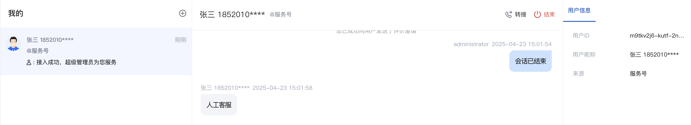 TUICustomerServer.initWithProfile({SDKAppID,userID,userSig,nickName: '张三 1852010****',avatar: 'https://im.sdk.qcloud.com/download/tuikit-resource/avatar/avatar_3.png'}).then(() => {TUICustomerServer.transferToHuman({specificMemberList: ['agent_account_1', 'agent_account_2'], // 请替换为您应用的人工坐席账号description: 'your description'});});