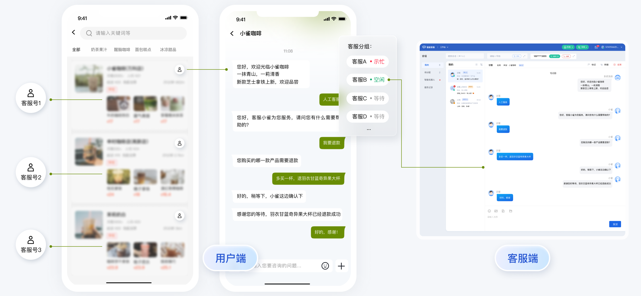 // 1. 初始化前将业务侧自定义的客服号 ID 传递给 UIKitTUICustomerServer.setCustomerServiceIDList(['customerServiceID_001', 'customerServiceID_002', 'customerServiceID_003']);// 2. 初始化时,带上要发起会话的客服号 ID,比如 'customerServiceID_002'// 如果不带上要发起会话的客服号 ID,则 UIKit 默认使用多客服号列表的第 1 个元素TUICustomerServer.initWithProfile({SDKAppID,userID,userSig,nickName: '张三 1562010****',avatar: 'your avatar url',customerServiceID: 'customerServiceID_002',});