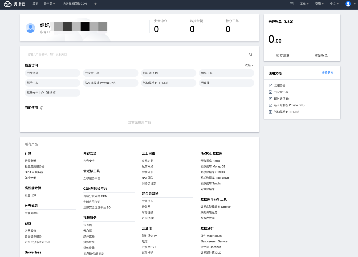,您可以查看最近访问与正在使用的云产品、监控告警、待办工单、未还账单等内容。