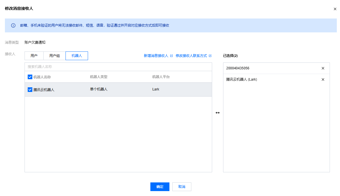3. 在修改消息接收人页面选择机器人,勾选需要接收消息的机器人,单击确定,即可在该产品子消息下配置添加一个机器人。