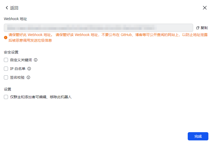 6. 添加完成后,界面会展示 Webhook 地址。