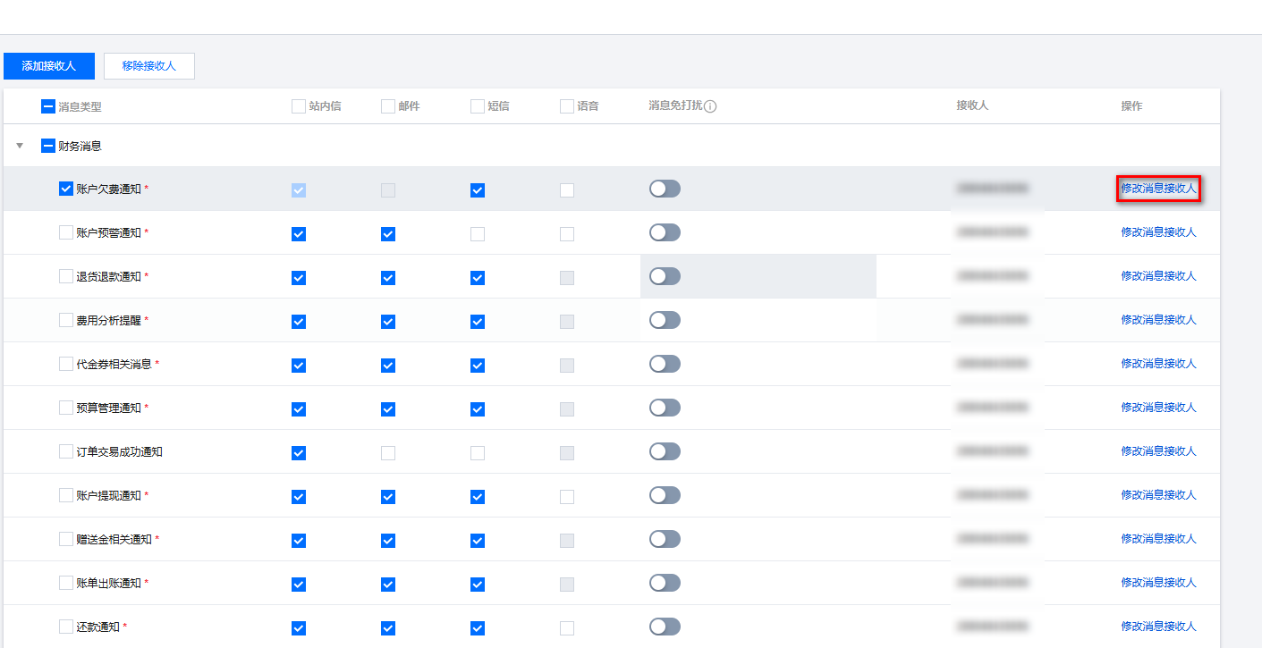 1. 进入 消息中心 控制台,单击左侧导航的订阅管理,进入订阅管理页面。 2. 选择您想要订阅接收的消息类型,勾选之后单击修改消息接收人进入订阅编辑页面。