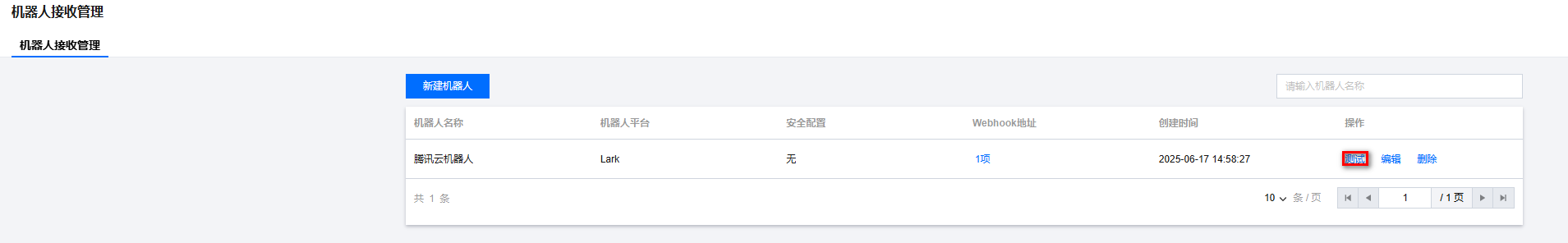 1. 在机器人接收管理中,单击测试。