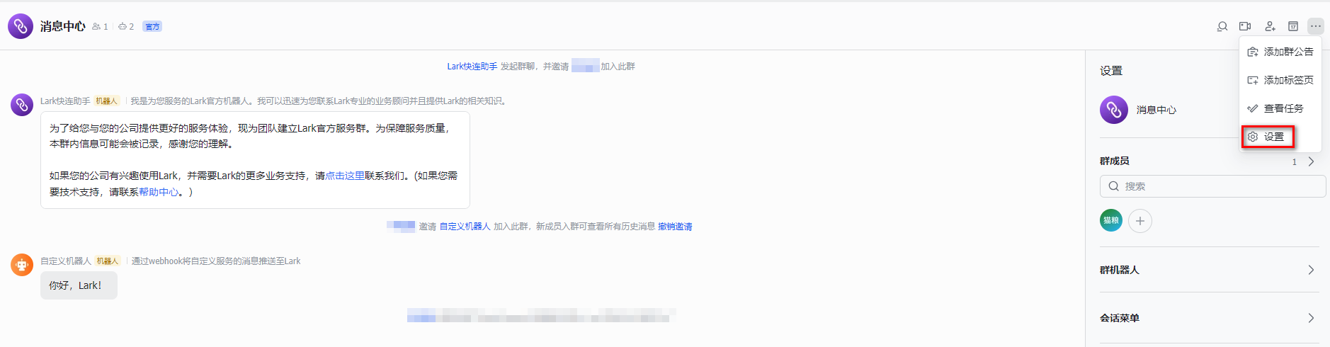 1. 在 PC 端打开 Lark,找到需要接收消息的 Lark 群,单击 。 2. 在设置页面,单击群机器人。